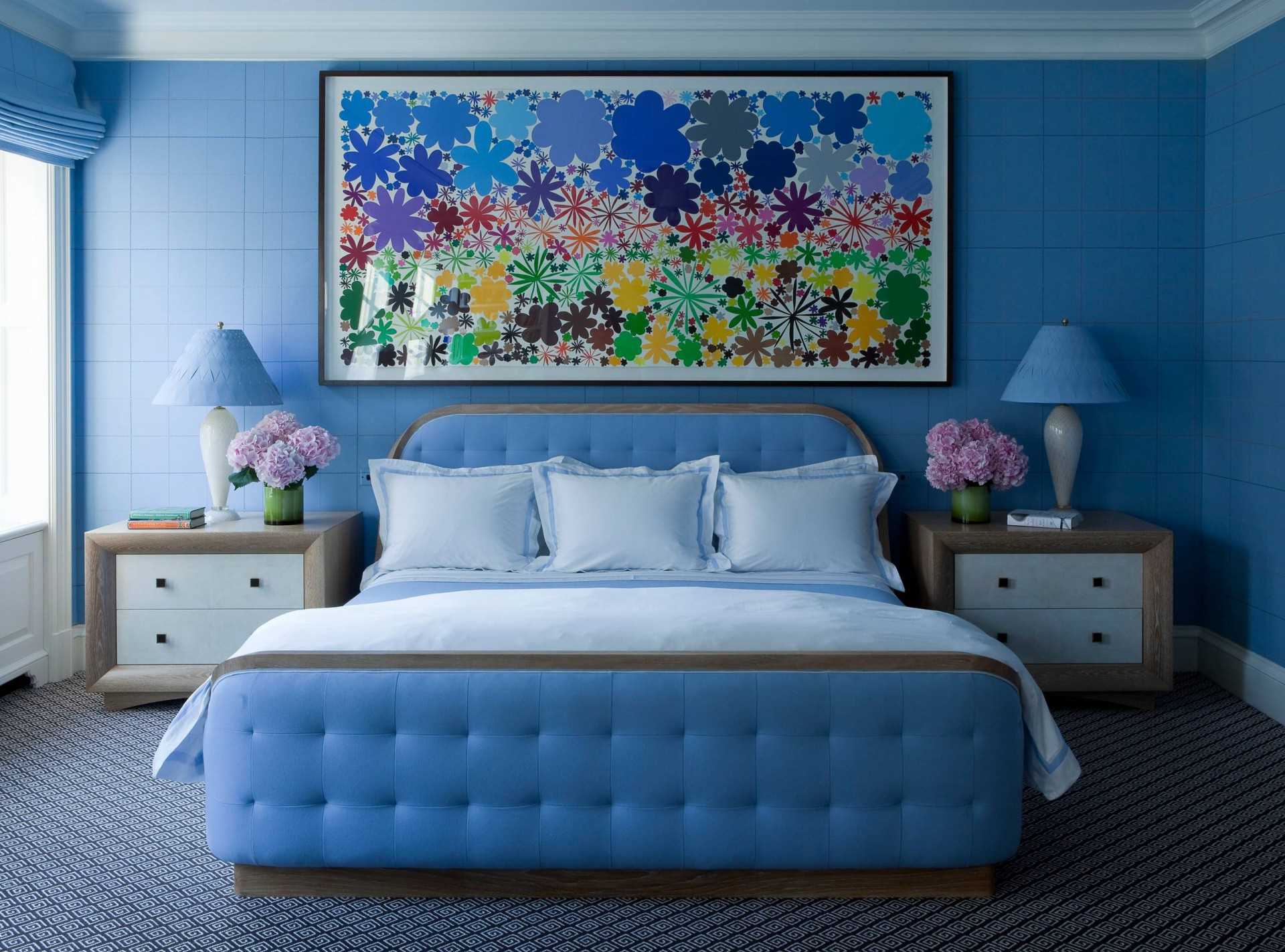 The blue color in the bedroom interior will look very beautiful