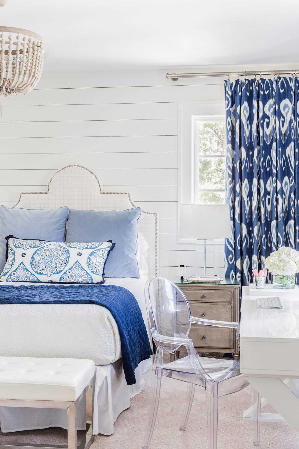 The combination of blue and white in the interior of the bedroom will look modern