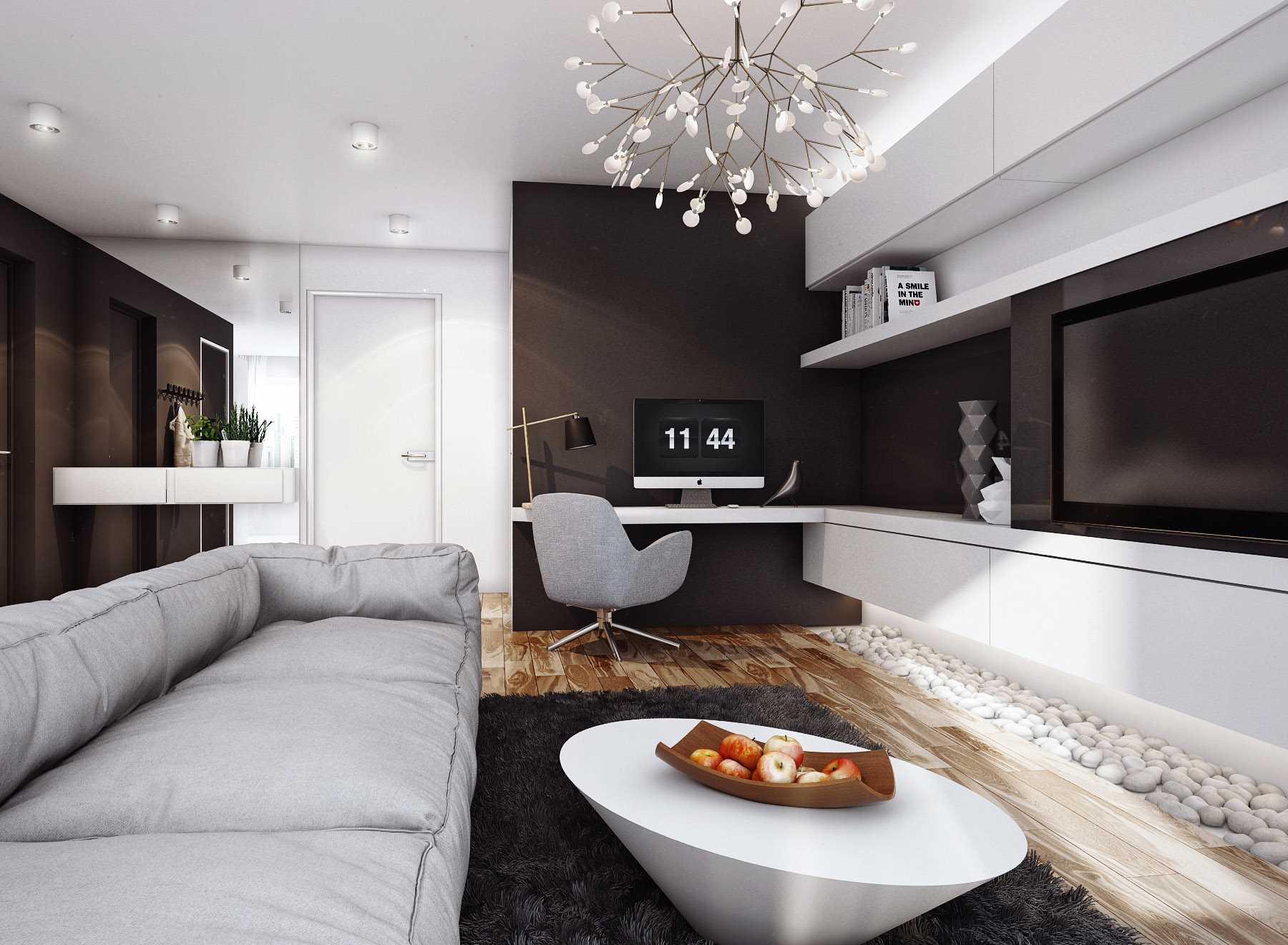 - When buying floors, skirting boards, doors and furniture, a maximum of 2 colors should be used. To obtain a certain effect, you can apply contrasting design. All interior elements should be in an equally warm or cold palette.