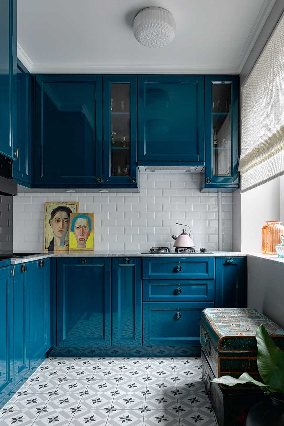 As a rule, in the kitchen and in the corridors they try to lay moisture-resistant linoleum, glue porcelain tiles or lay a moisture-resistant laminate. The variety of patterns allows you to vary when choosing the color of the walls and facades of furniture.