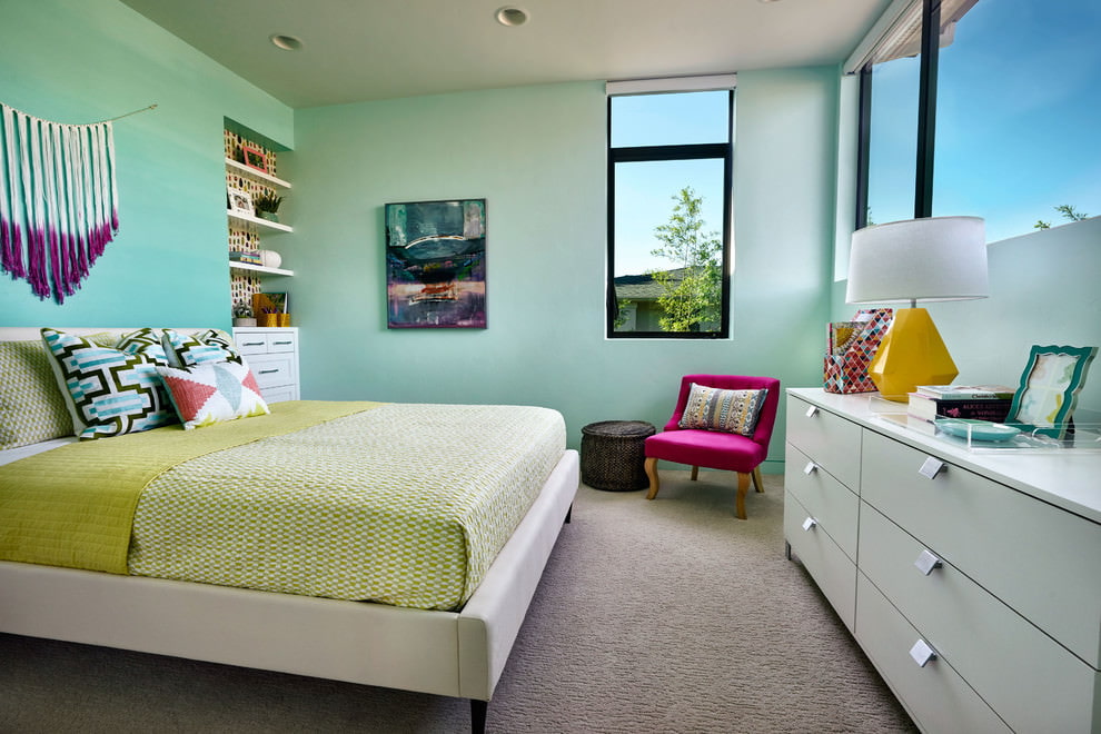 Not only a light palette can become a successful ally of the menthol palette. More expressive shades cope well with this task. Being a representative of the pastel gamut, menthol provides a lot of opportunities for successful experiments. It looks best with green, orange, pink, yellow, coral.