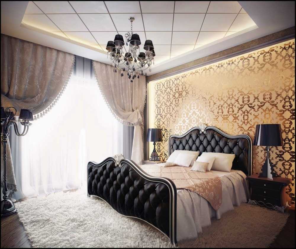In combination with gold, the direction of baroque is realized, which emphasizes the grandeur of the room. The same effect will be from the composition with black. A heavy carved table and black-and-white curtains collected by the forks complement the composition and give the living room a majestic and aristocratic look.