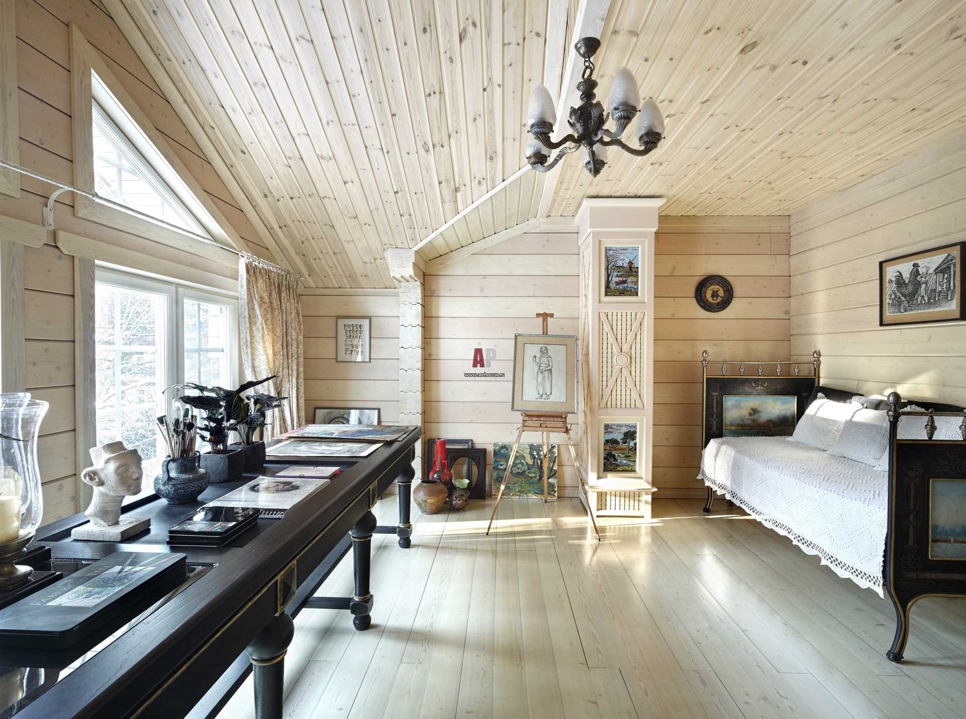 The historically established characteristic feature of the direction is the active use of wooden materials. The walls, ceiling and floor are sheathed with boards, the furniture is made of the same material. Often used chests with traditional ornaments. In the modern version of the style, rafters and beam ceilings are required.
