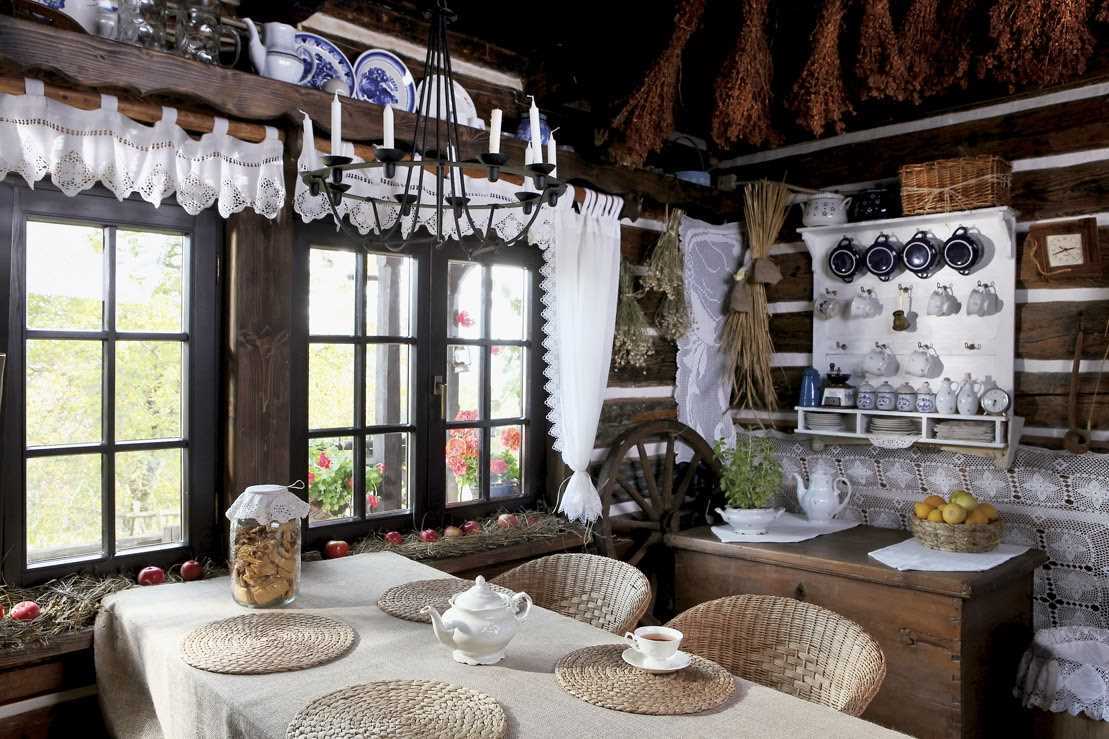 The kitchen needs to be made light: the ceiling is whitewashed with lime or water-based paint, the walls are glued with plain light wallpaper (floral ornament is possible), it is recommended to lay the rugs on the floor. To decorate the room, use herbariums or straw figures; napkins, curtains and potholders made of natural fabrics, hand embroidery will be a wonderful touch.