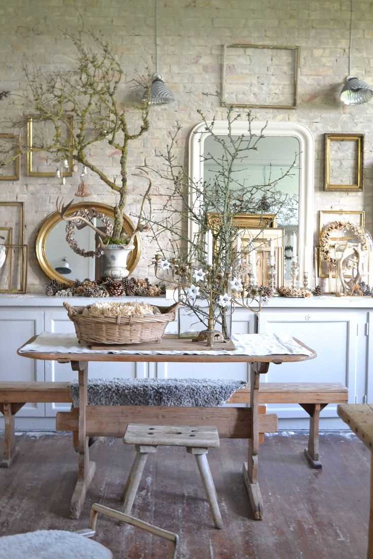 For wall decoration, natural and decorative stone or brick are perfect, you can paint them in a plain color. Furniture, dishes, decorative elements should be made of natural materials: glass, wood, stone or paper. Upholstery with small flowers is acceptable for sofas and armchairs.