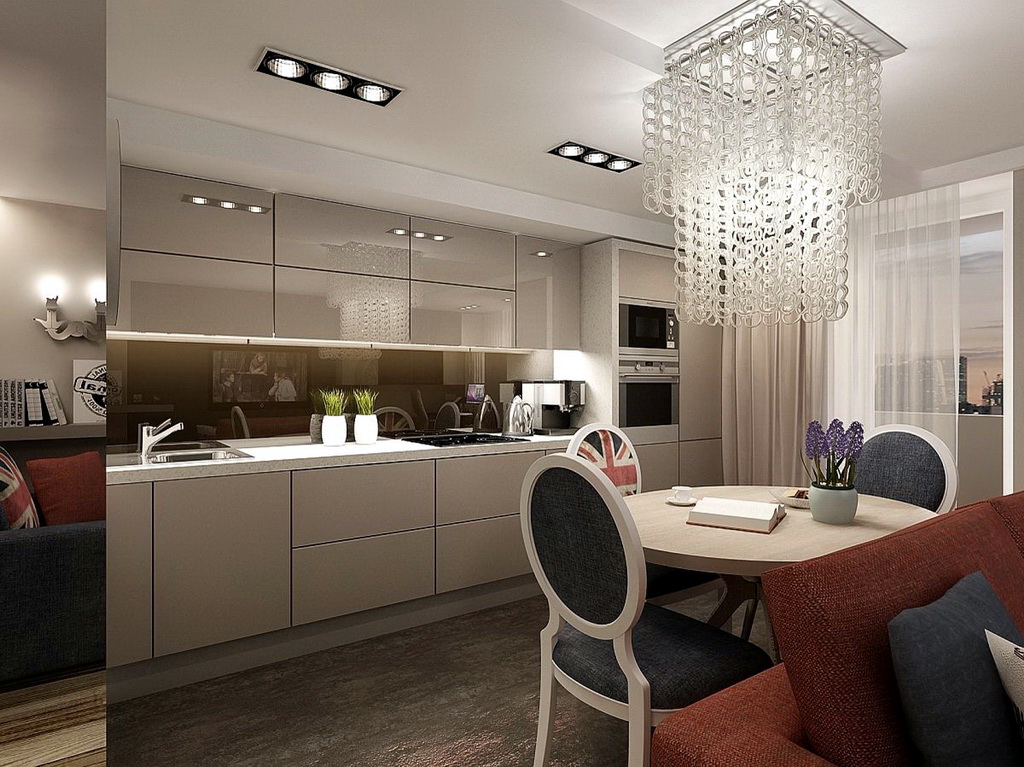 - The illumination of the space should be excellent. One ceiling chandelier is definitely not enough. Lighting devices should be placed above all working, dining surfaces.