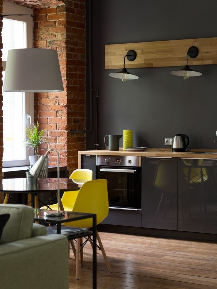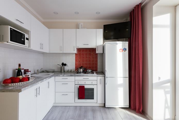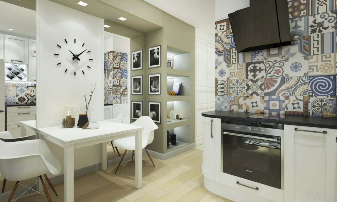 | Finish | You can separate the kitchen from the living room-bedroom by using different finishing materials, colors. In the kitchen, it is better to use tiles, in the residential part of the room - wallpaper, decorative plaster, paint. |