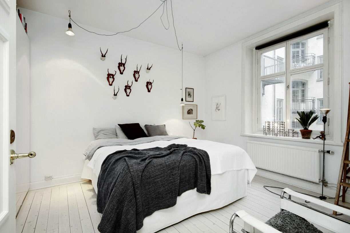 White color always dominates the arrangement of the Scandinavian bedroom. These are walls and ceiling painted with white paint and creating the main background, furniture made of light or bleached wood. The entire interior is designed in a white palette - from window frames to flooring.