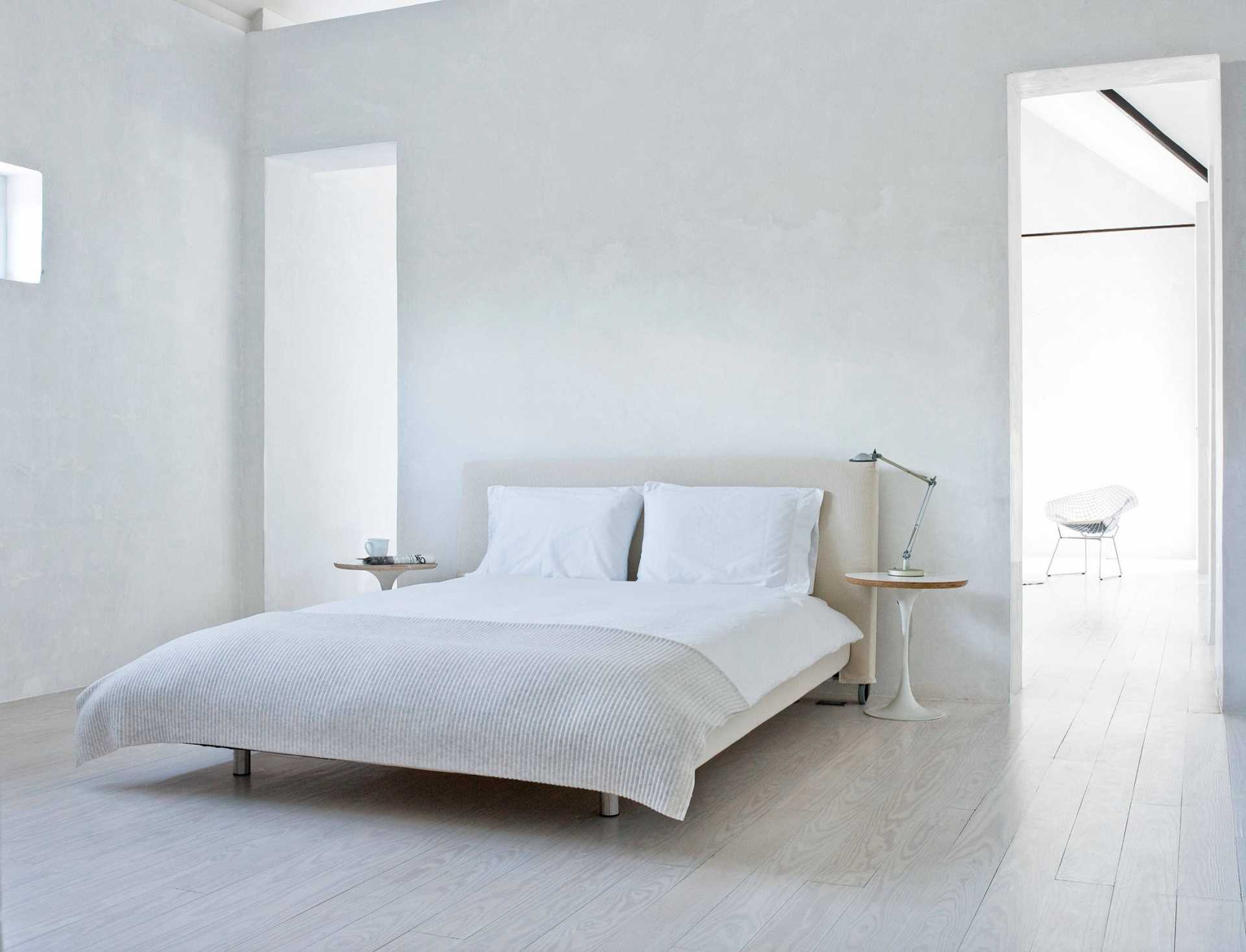 A white bedroom with a wooden floor will look very nice