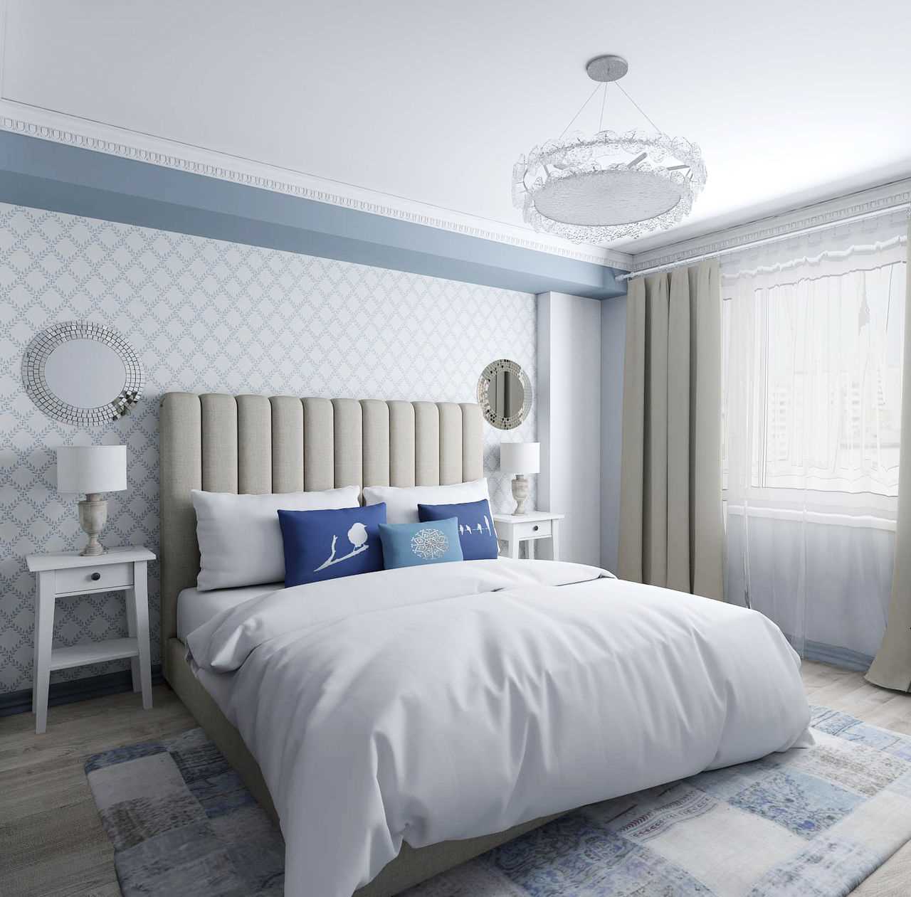 The design of the bedroom is made in white with a very beautiful blue backlight bed