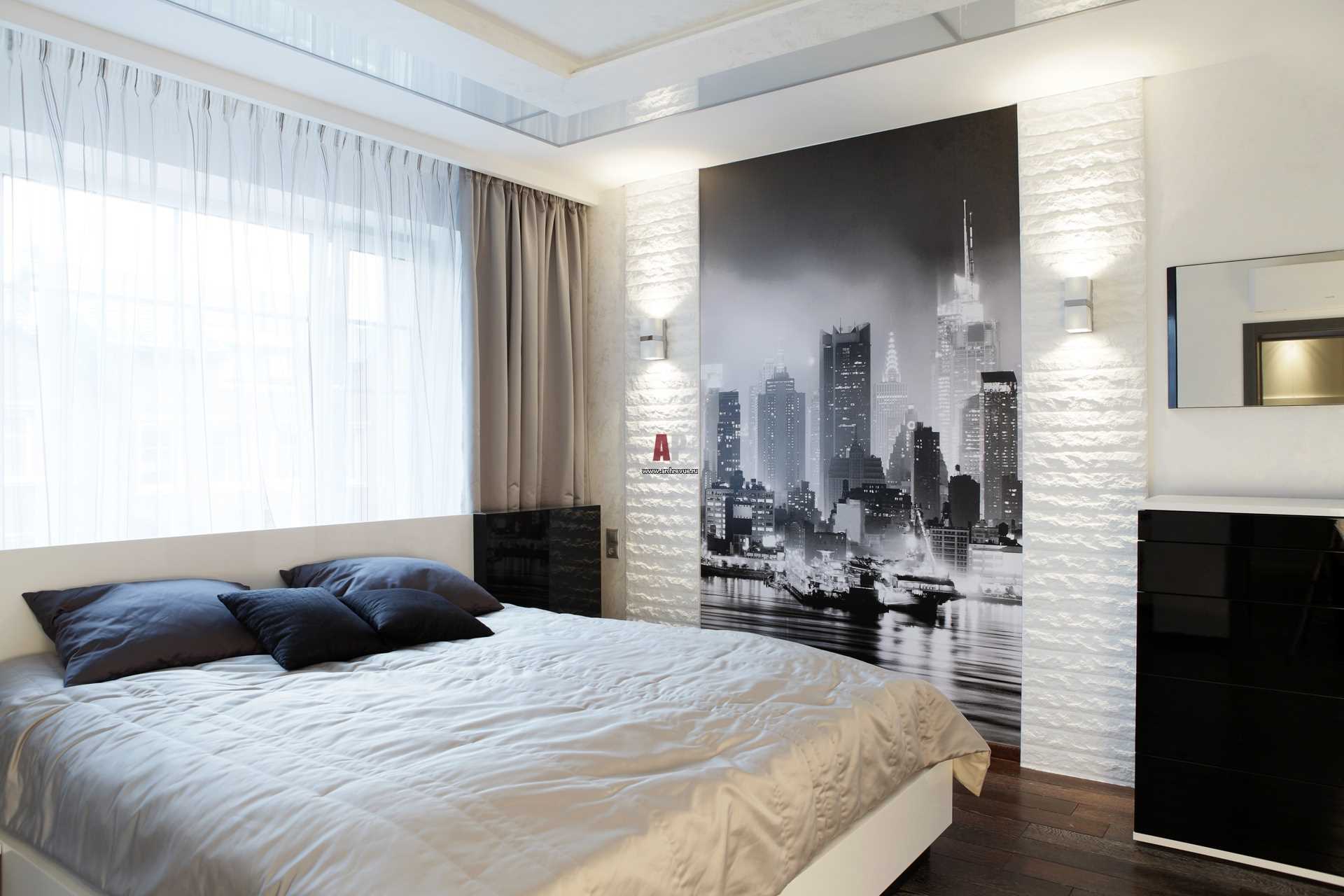 The design of the bedroom is made in a modern style with a stretch ceiling in black