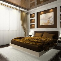 Mirrors and glass surfaces - effectively increase the space of the bedroom. It is possible to place a mirror on the wall, and a mirror ornament with a pattern, made by technology: sandblasting. The main thing is not to get carried away too much with mirrors, everything should be harmonious and in moderation. Mirror surfaces are mounted in those places of the room where the bed will not be reflected. Glossy surfaces are used for the same purpose. Gloss reflects objects, in the fashionable direction they make glossy false ceilings. Gloss is a brilliant solution for decorating the ceiling!