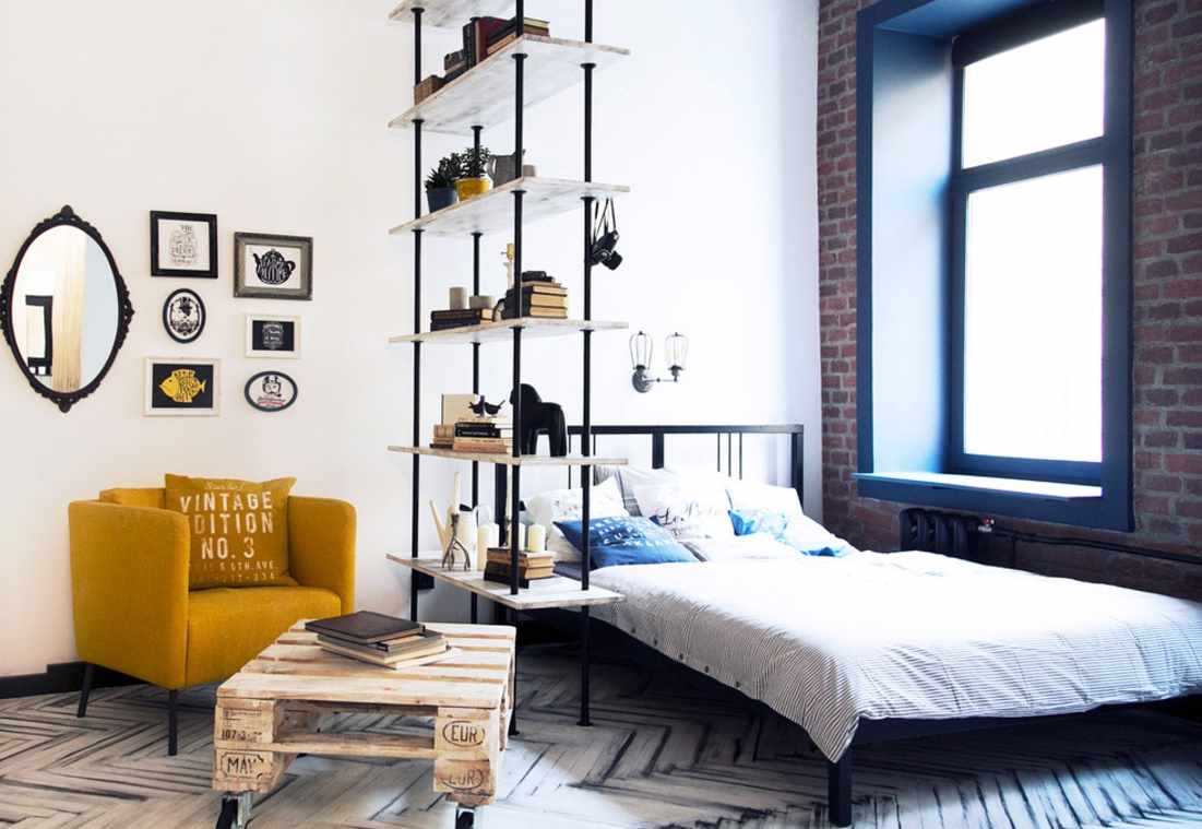 The bedroom space will look good if everything is done in the same color (except gray). The lack of a palette can be compensated for: