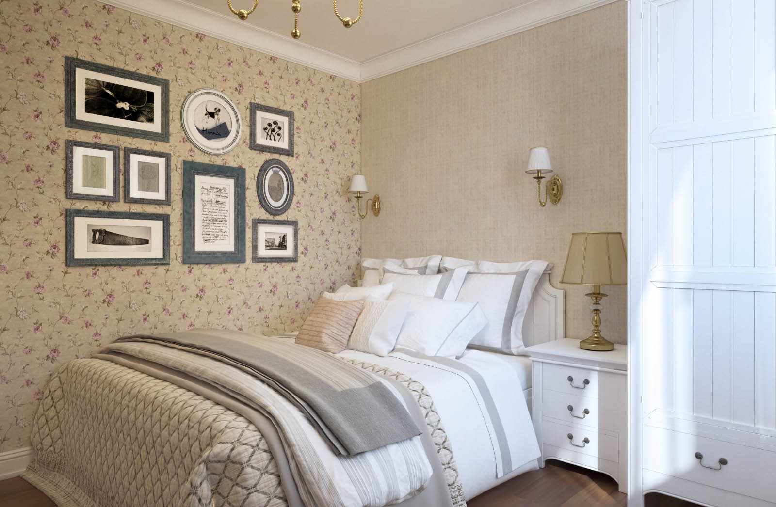 Ideal for a small bedroom.If the room is bright, then one of the walls can be distinguished by dark wallpaper with a geometric ornament. |