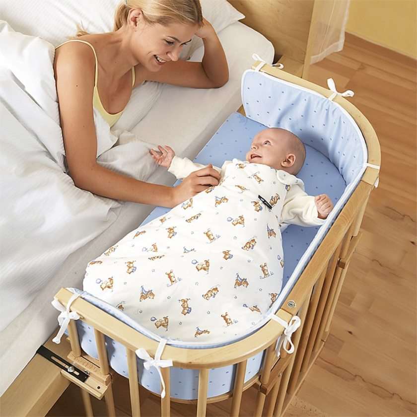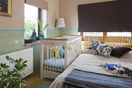 The most common situation is when a crib in the parents' bedroom takes place next to the matrimonial bed, which makes it convenient to look after the baby.