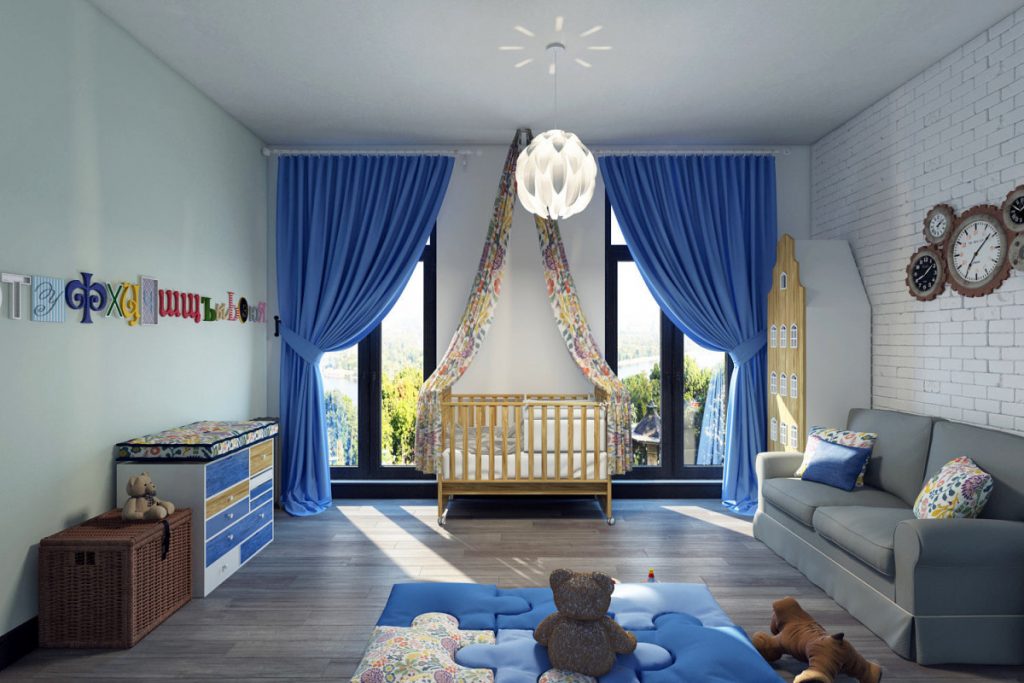 Sunlight can awaken a child, interfere with his daytime sleep. Therefore, choose blackout curtains that allow you to prevent natural light inside. You can choose bedding and a bedspread to match the curtains.