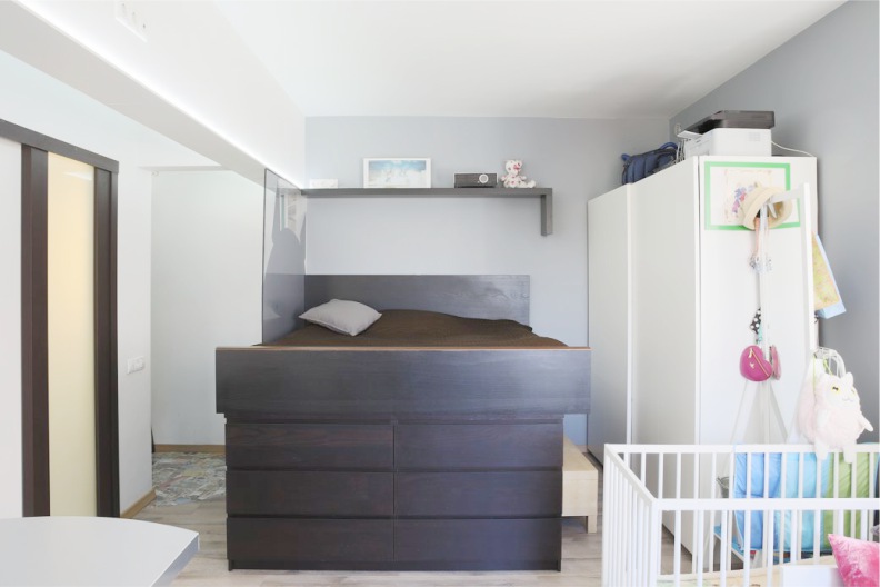 The described recommendations suggest a temporary residence of the child in the room of parents. But if it is not possible for a grown-up baby to move to another room, it is important to think everything in such a way that in a few years to make some changes. Bedroom interior with cribit will subsequently be divided into zones, which will allow everyone to feel comfortable. To highlight each segment, a podium, furniture and a palette are suitable.