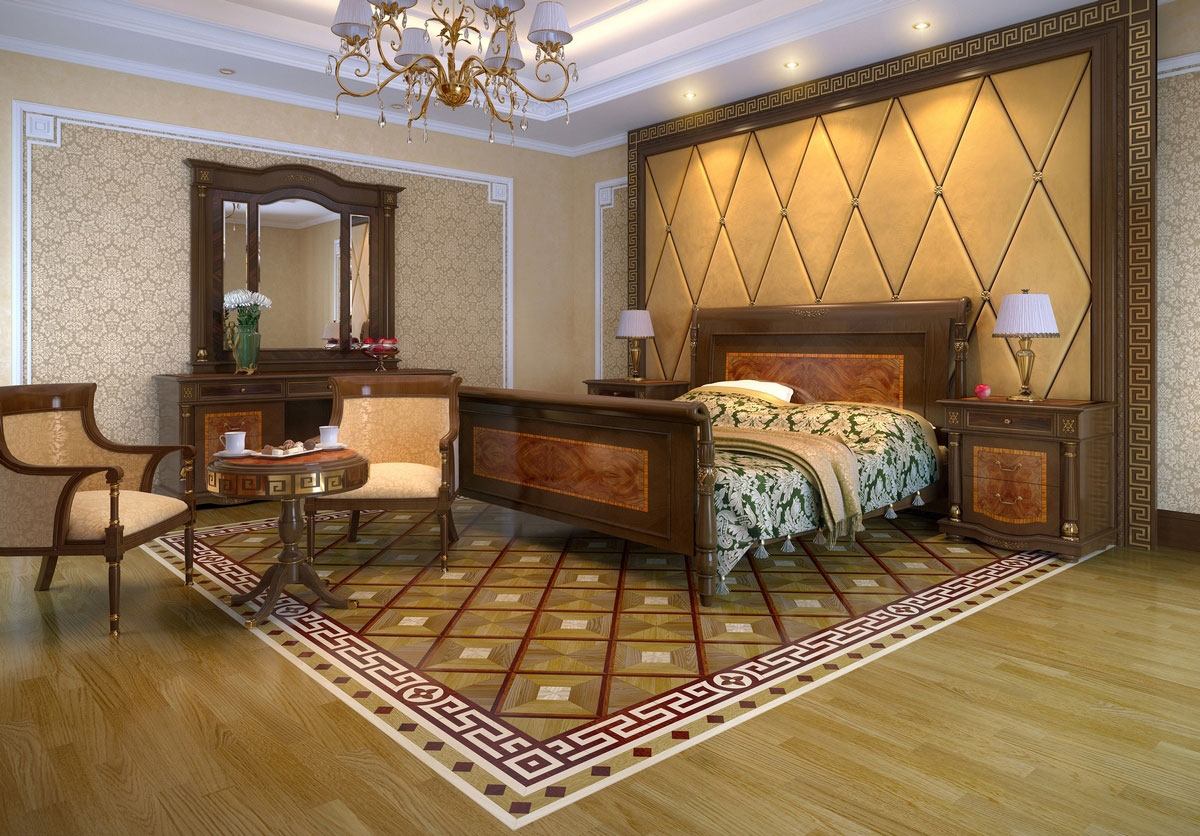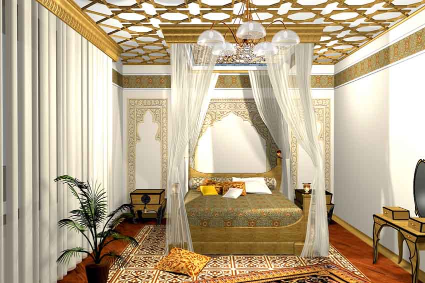 All surfaces must be in harmony - this is the secret to the success of the cladding. The choice of wall covering is limited only by financial capabilities and a stylistic choice. Today, the assortment of building materials is so large that even palace design of a bedroom can be made quite affordable. It is distinguished by molding and molding, false wall decor and false rosettes on the ceiling. Equally important are accessories and furniture.