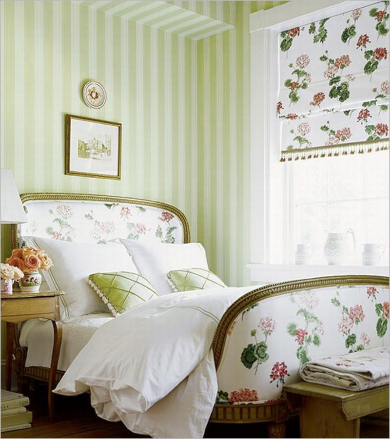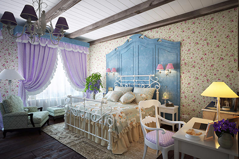 What bedroom will do without a lot of textile filling? Bedspreads and decorative pillows on the bed, curtains on the windows, furniture upholstery - everything should be done in uniform colors. This style loves a small and large floral print. The main rule is not to oversaturate the interior! If the walls are painted with monophonic paint, then make the design of the same color, but with a pattern, for example. In the case of using colorful wallpapers, it is better to take a coarse homespun cloth of monophonic coloring for the rest.