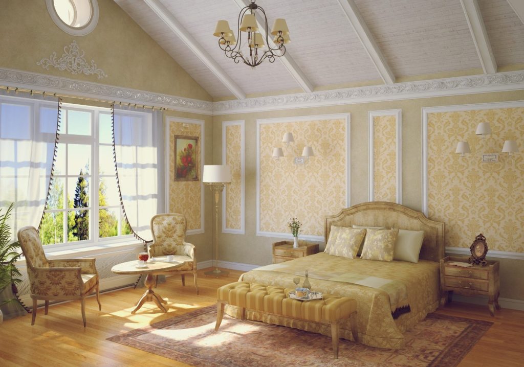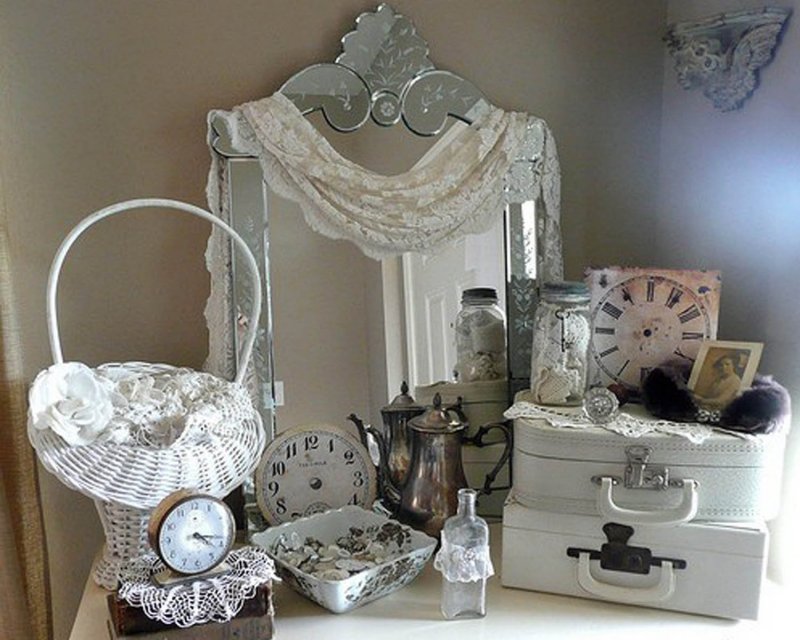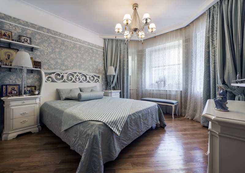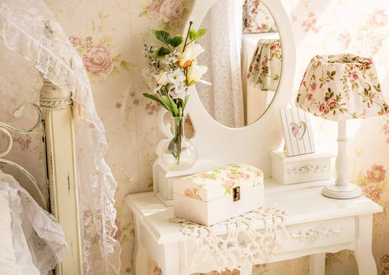 A tall, roughly knitted cabinet with carved legs fits perfectly into the overall ensemble. A dressing table and an original mirror perfectly complement and enliven the interior. Facades are often painted in pale shades or make decoupage of doors. If there is a large area, the decoration of the room can be supplemented with a bedside table or even a tea ensemble of two armchairs and a table, but this is possible only when the bedroom is quite large in area. The same is true for studio rooms, which have recently been popular not only in urban new buildings, but also in country houses to save space and optimize its use.