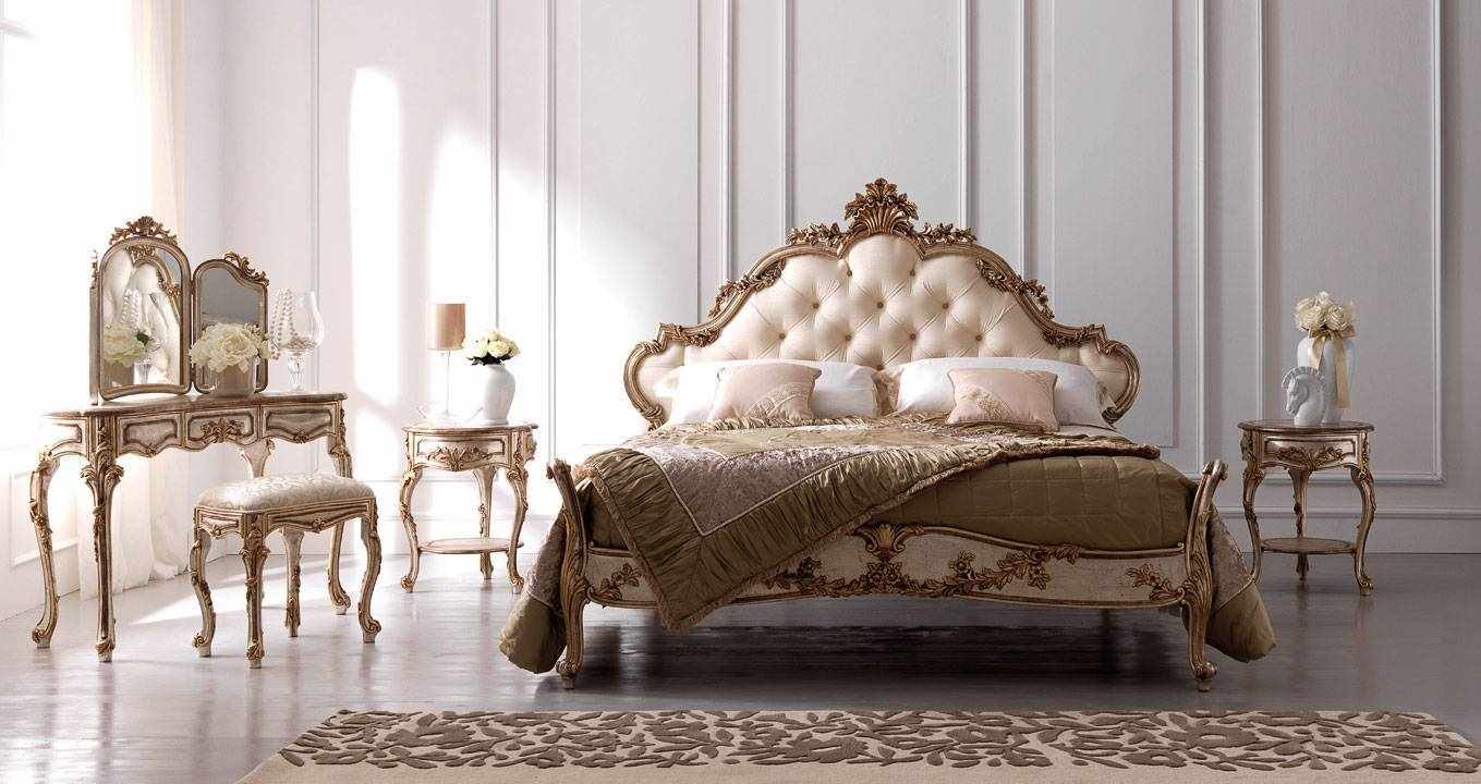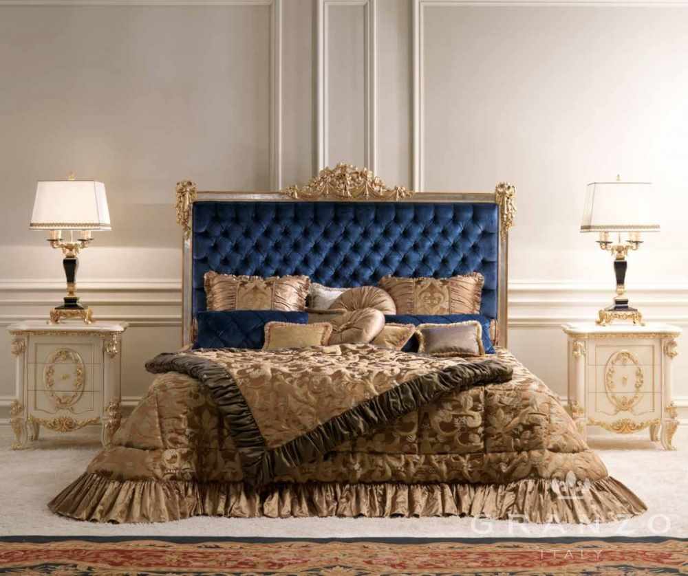 The presence of gilding. The headboard has fancy gilded shapes that can be mirrored. Aged mirrored surface in a frame with gilding, looks gorgeous. The wall can be decorated with a mirror panel, which will add room and air to the room.