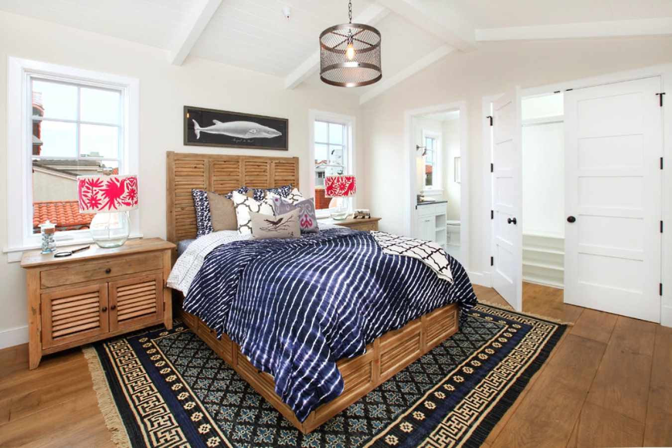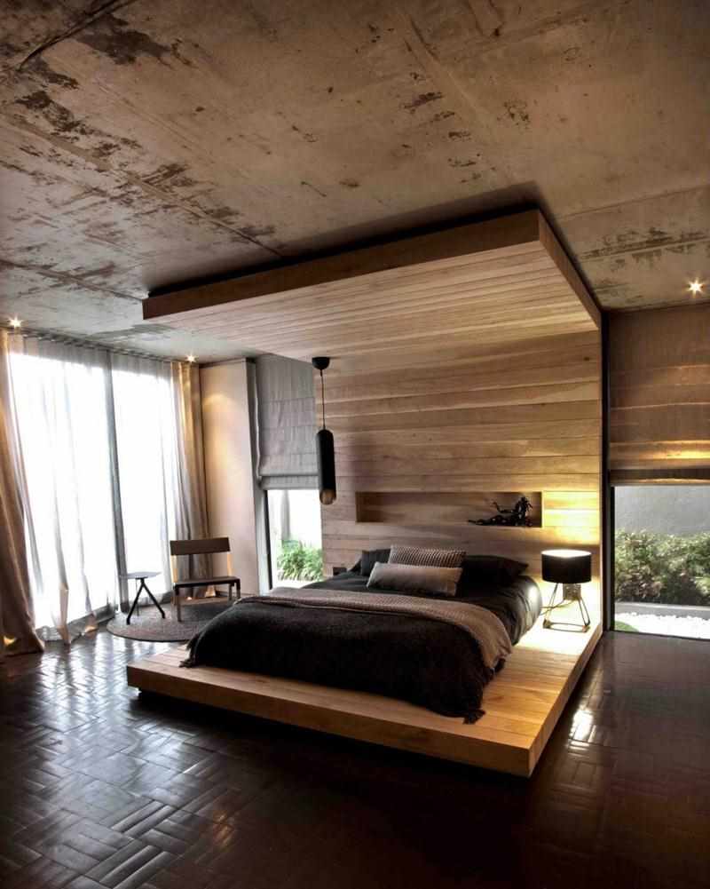 The headboard made of wood moving onto the ceiling perfectly complements the overall interior of the room.