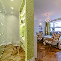 Bedroom and work space. A large bed is placed to the window, and armchairs and other places for guests along with a compact table are located at the door. The recreation area is fenced with a rack with little things. A separate element of the zoning is the floor covering.