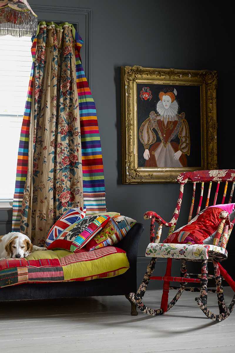 Multi-colored sofa in the interior of a room in the style of boho