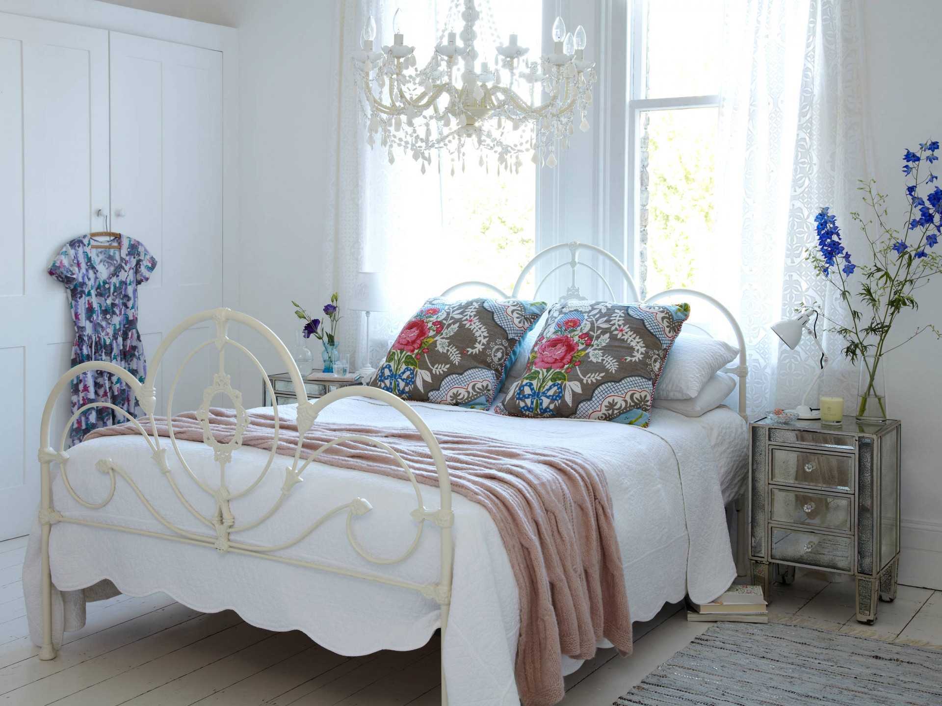 The bed on the legs in the vintage version fits perfectly into the design. Also, extra pillows will look great, randomly located on the bed and multi-colored bedspreads, laid out so that they are in sight. The main thing is not to overdo it with a coloring. After all, the bedroom is a resting place and calm tones should prevail here. At the same time, small bright spots in the interior will not be superfluous.