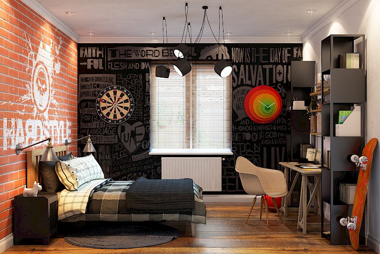 A bold and aesthetic mosaic is collected bit by bit. Walls can be decorated with various graffiti, collages from pieces of a magazine, patterns on raw plaster, posters, road signs, paintings.