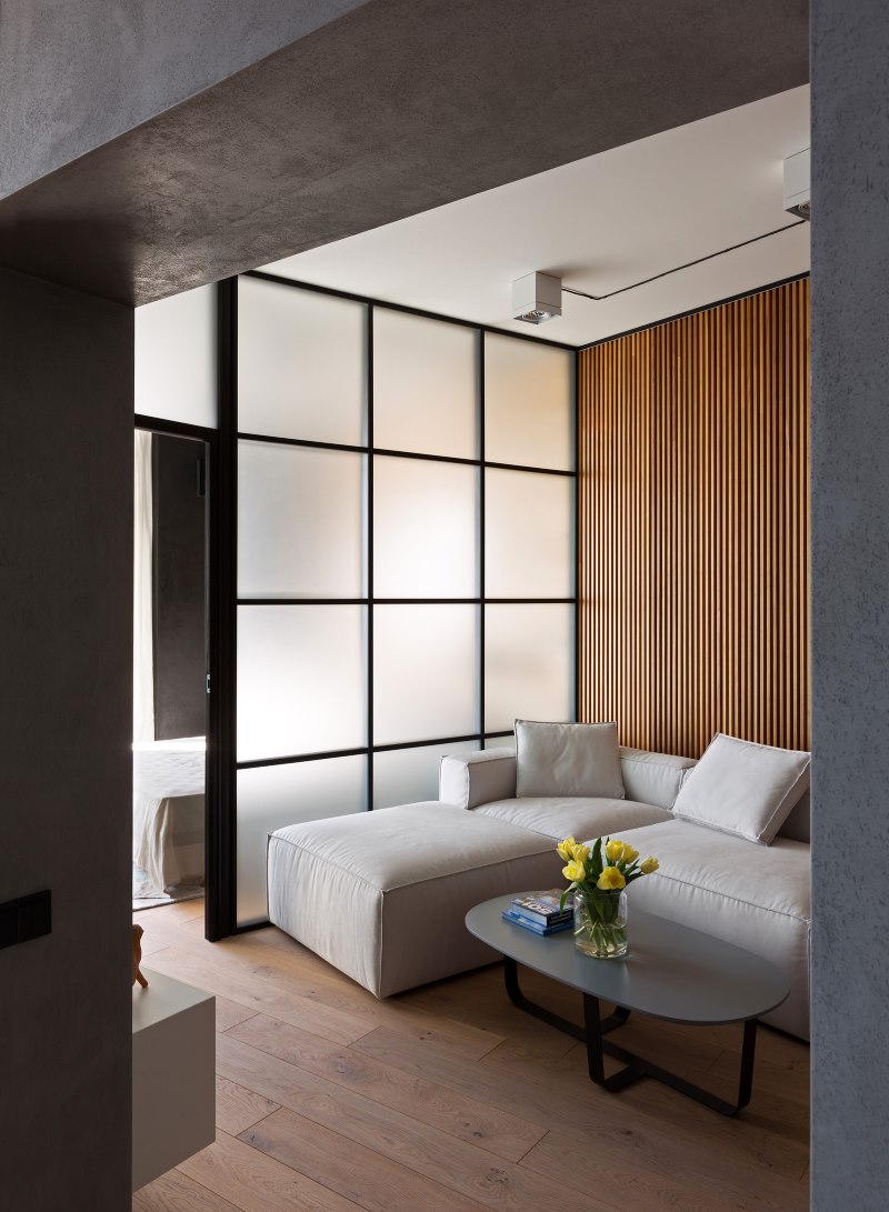 Zoning as such can be practically absent, and furniture is often rearranged, depending on the mood, especially if it has wheels. Different zones can be visually separated by podiums, ceilings of different heights, mirrors on legs, large sculptures, columns and beams. The bedroom from the living room should differ in the material of the walls or flooring.
