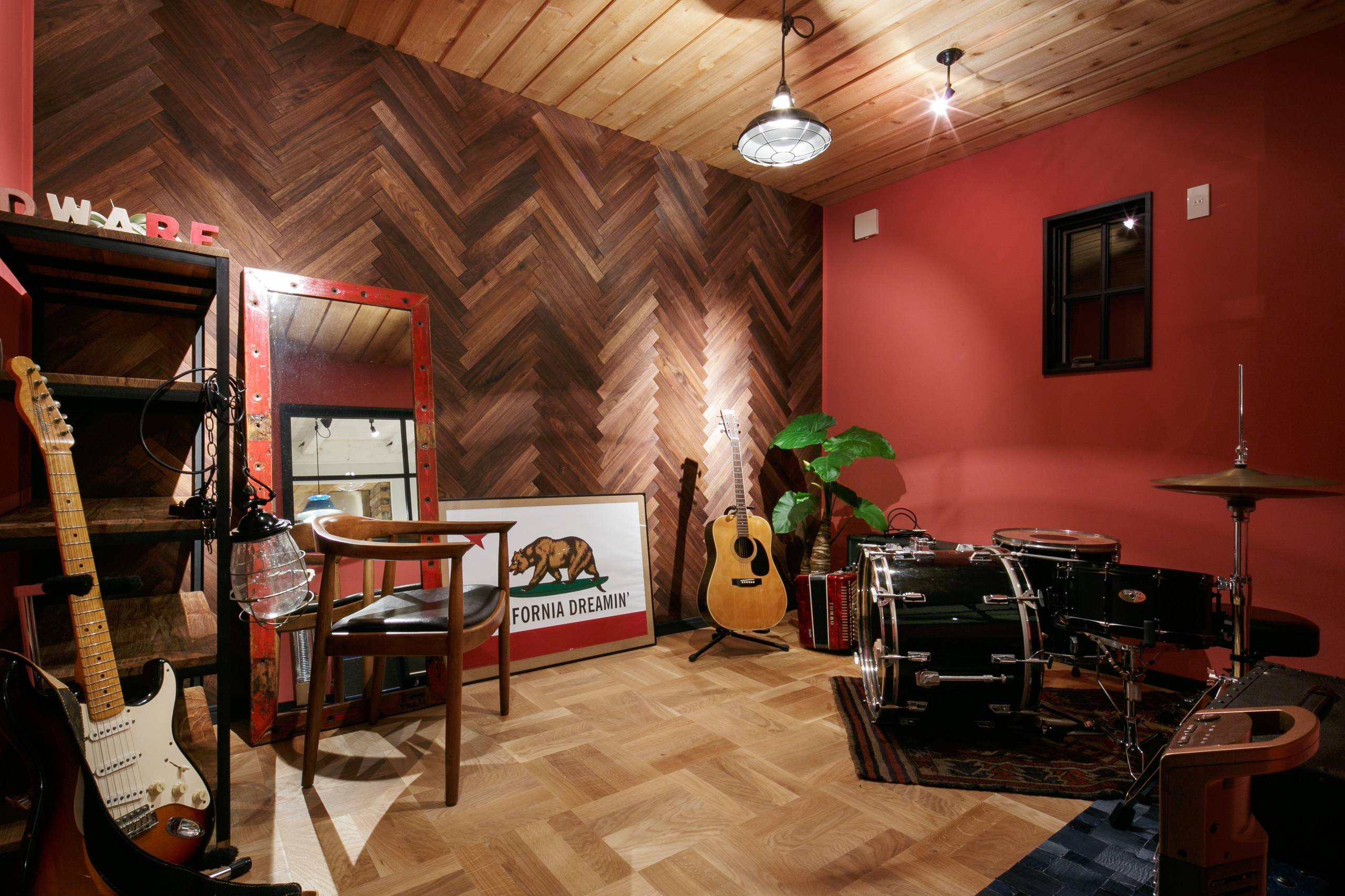 For the decoration of the room used wood, concrete and brick, and the decor is a lot of copper