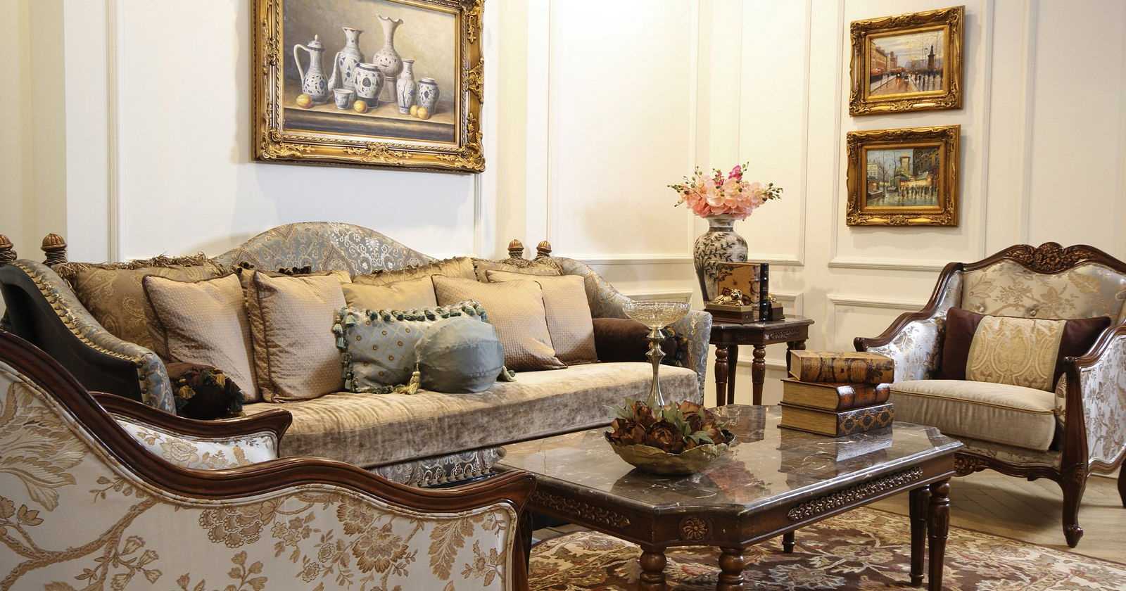 If you prefer soft sofas and armchairs with colorful upholstery, then textured plaster, wall painting or wallpaper is better than plain. Textile or paper rolls with graphic patterns - for plain furniture and curtains. Upholstery materials and curtains should look luxurious and expensive, regardless of real value, for example, golden satin or furniture brocade, colored tapestry or plain jacquard with overflows.