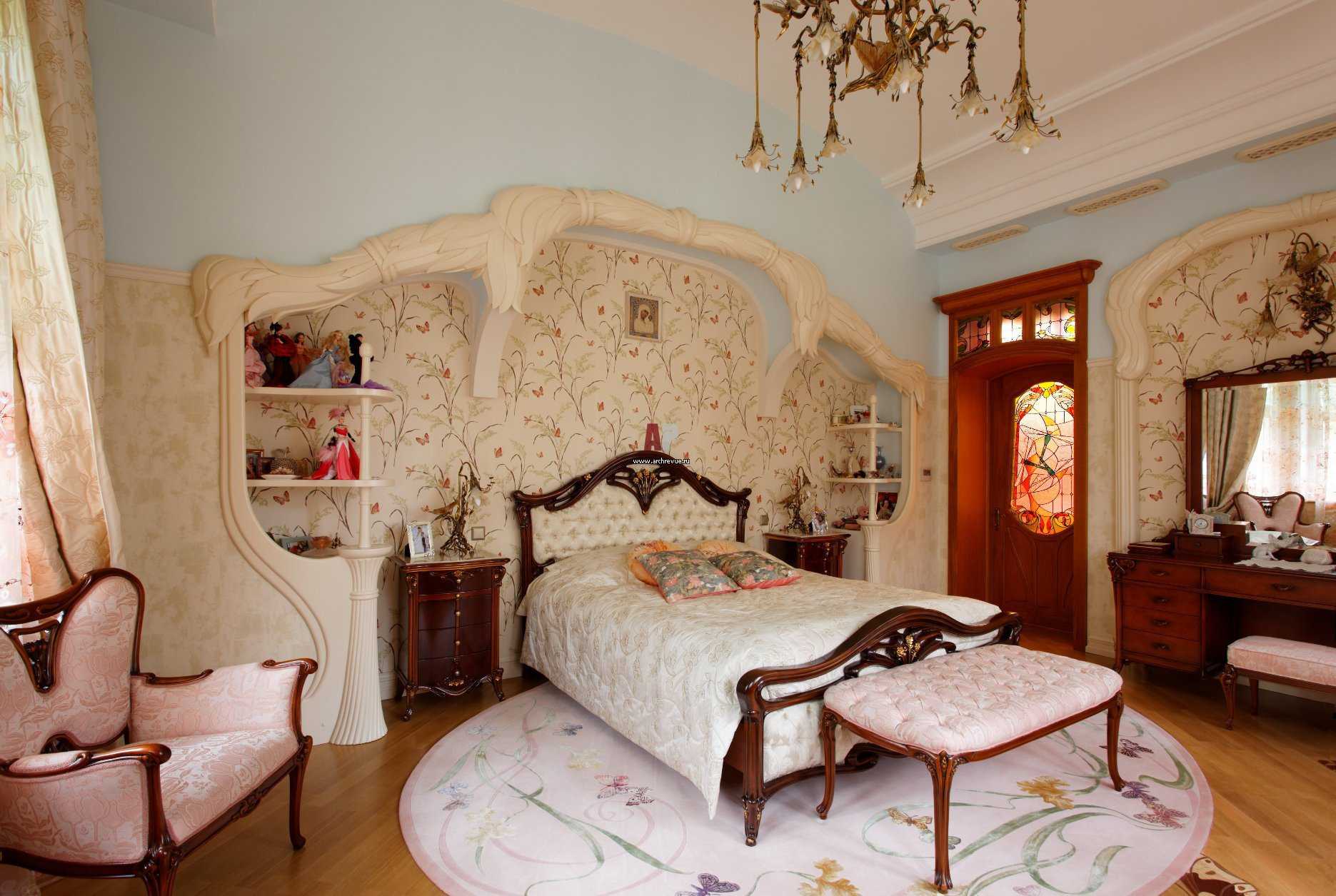 For general harmony, experts propose painting the wall with flying butterflies, elves and fairies with dragonfly wings leading to the open gates of a fabulous country. Light carved partitions for zoning, spectacular curtains and lamps, a rug with "grass" are appropriate. The room of the little princess in the Art Nouveau style is a delightful fairy tale at home.