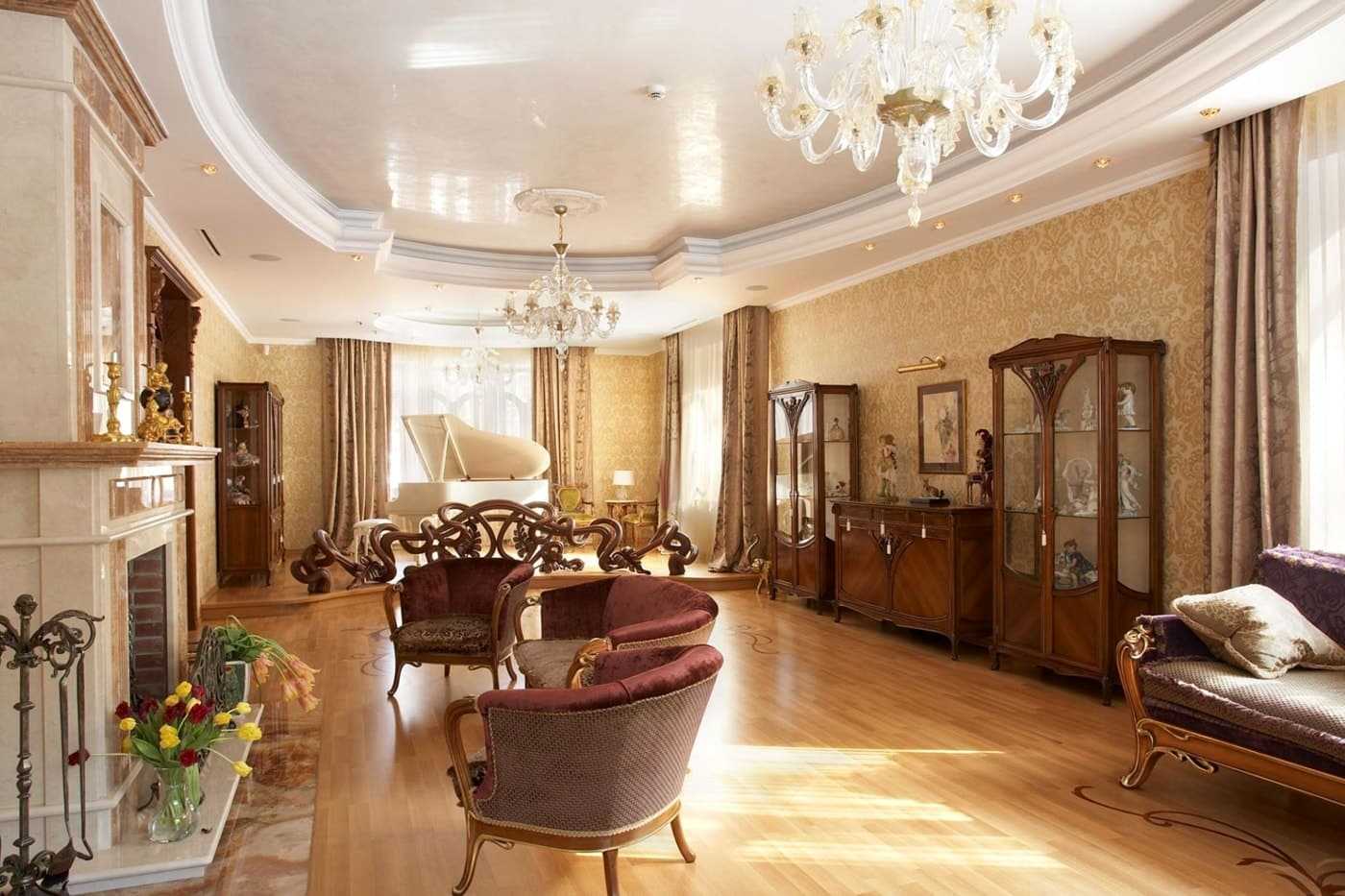 Tip: The ceiling should not be overloaded with decor, if it is in abundance on the floor and walls, in stained-glass windows and doors. In the living room everything should be in harmony and surprise with an exquisite taste.