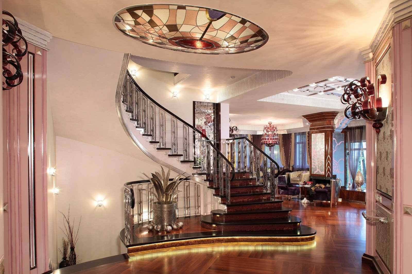 Tip: The aesthetics of "decline and elevation" organically fits into residential and non-residential buildings, is well perceived in the interior decoration of rooms. Upon completion of the repair, place an order for doors with stained-glass windows in the Art Nouveau style, they will become the "business card" of recognizable styling. Also, do not save on forging in the railing of stairwells, on ornate patterns and graphics that adorn the walls.