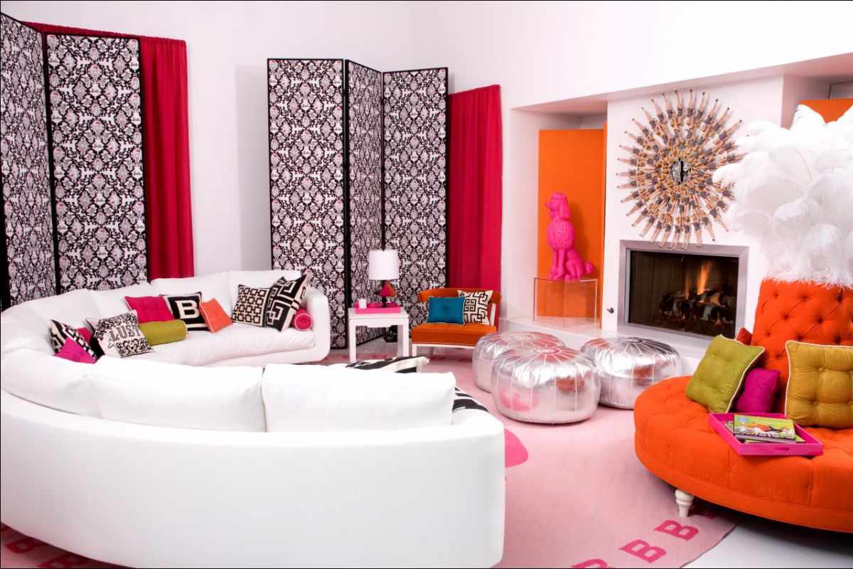 It is important to use a lot of pop style decor: unusual flower vases, lots of colorful pillows on sofas, and a maximum of lighting. At the same time, the more unique each detail is the better.