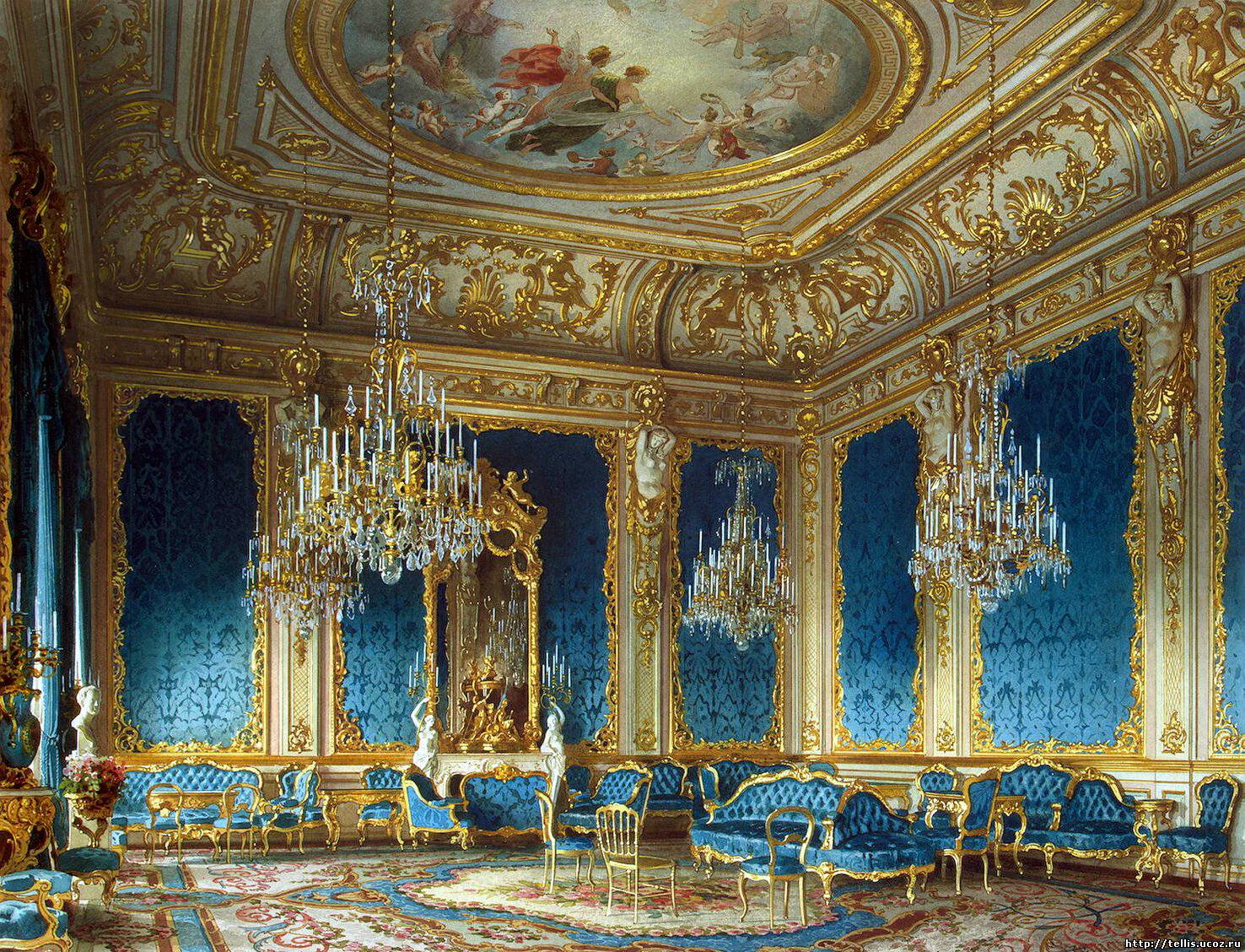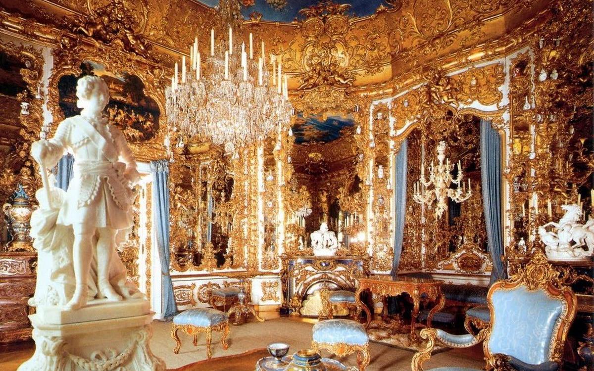 - large details (frescoes, sculptures, gilding); - color contrasts; - massive furniture; - expensive fabrics |