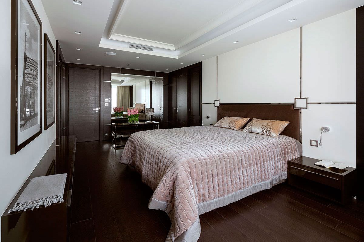 Recently, it is fashionable to make a bedroom in the style of minimalism. This means the absence of bright colors, interesting details. Of the furniture there is only a closet and the bed itself. In this situation, the basis of design is the finish. There is no more advantageous classic color combination than light and dark brown. Playing in contrast makes the room surprisingly interesting.