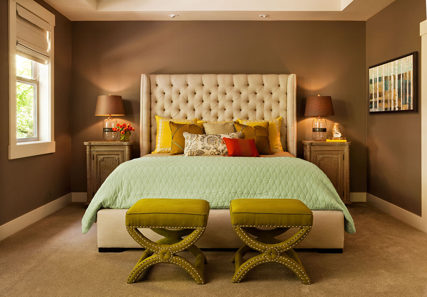 Brown poufs have become bright accents in the calm atmosphere of a country bedroom