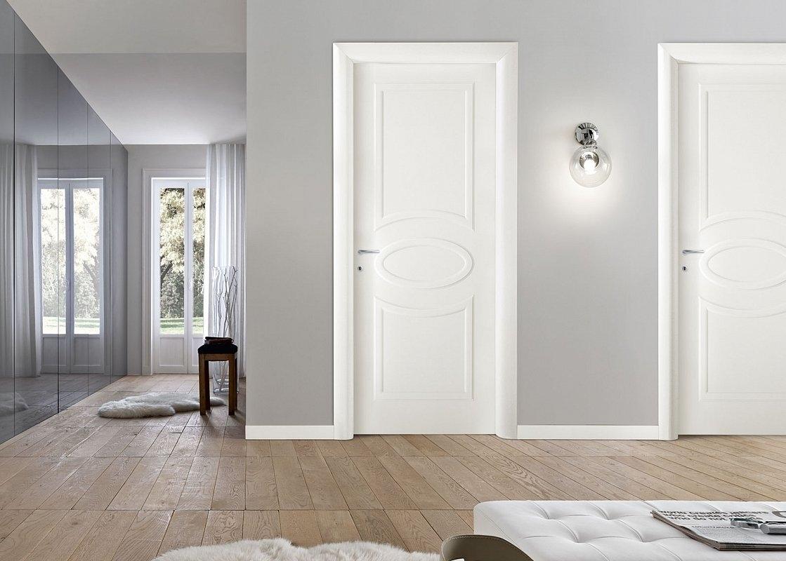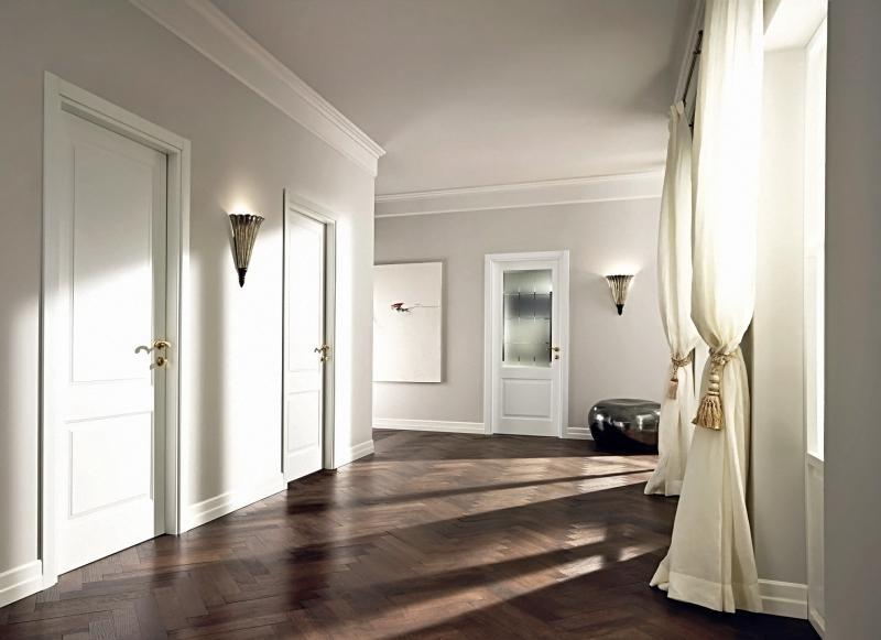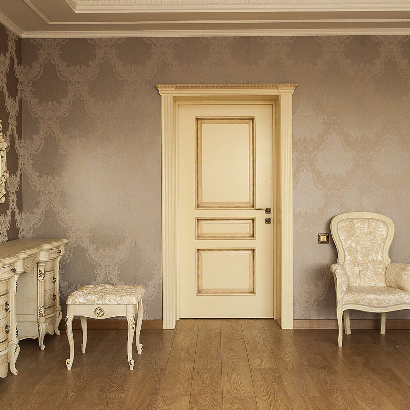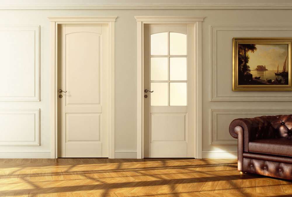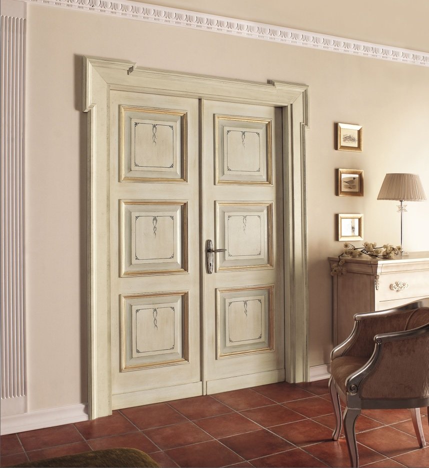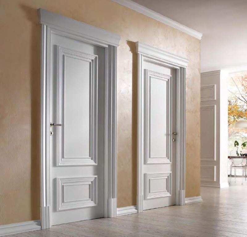 In the classic interior, birch doors with voluminous inserts and carved platbands are often used