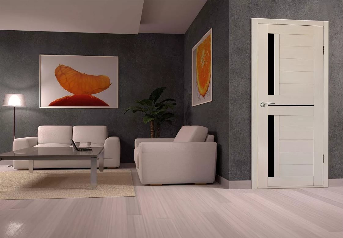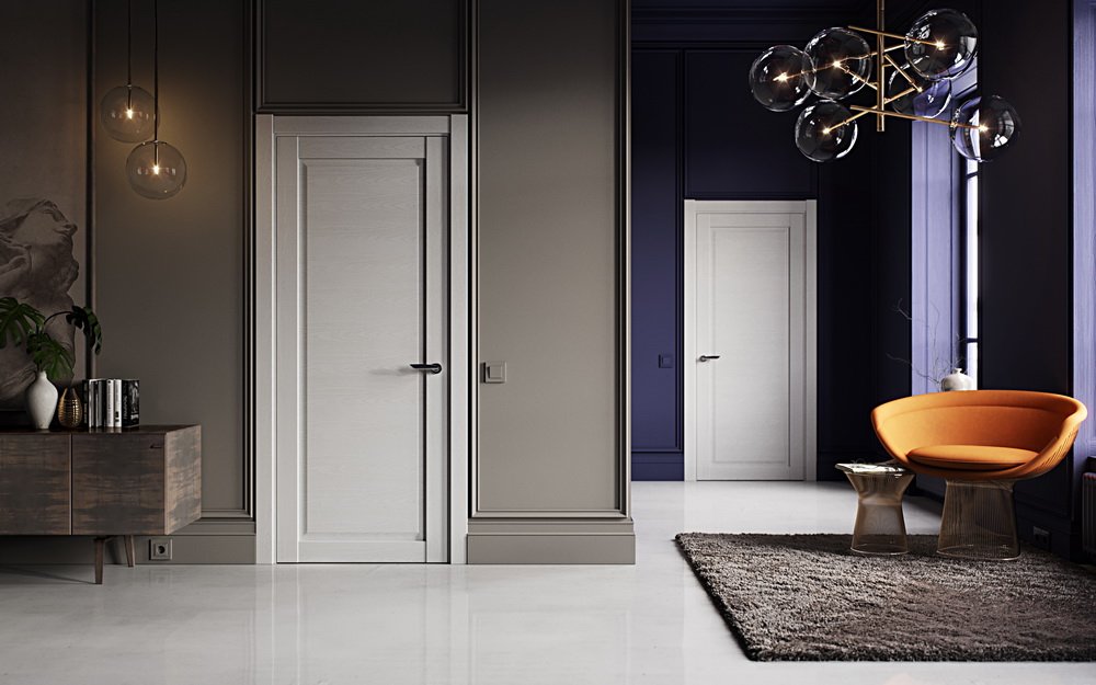 Do not rely on gray for the whole room if you select a fashionable shade of the door with a spectacular design of inserts. It can inspire despondency; bright accents are needed for mood.