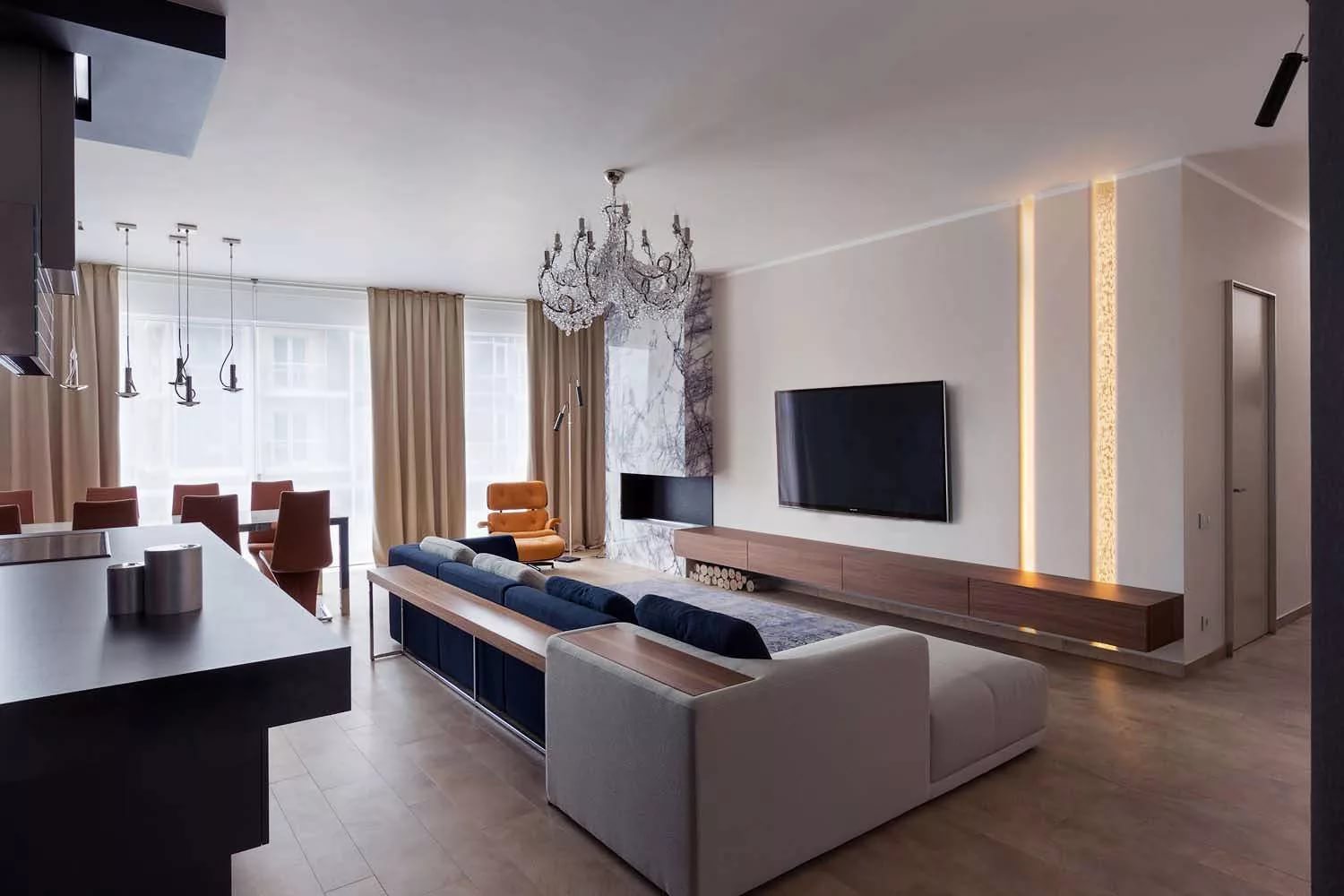 There is something very luxurious in the majestic combination of marble with streaks of wood. The combination of natural materials brings life to the modern interior of the apartment and can be combined in many ways.