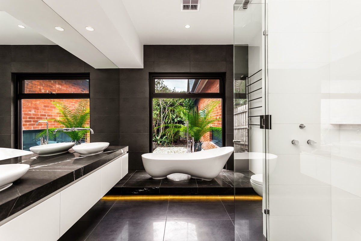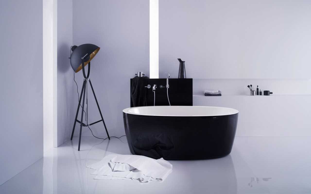 The combination of white and black in the interior of the bathroom looks very beautiful
