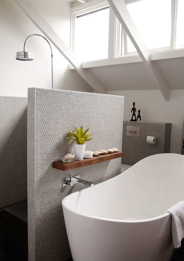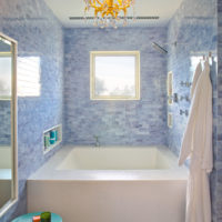 Porcelain tile has a large area. It’s easier to work with than with similar materials. But it’s worth preparing for big waste. You can design the floor and walls with an identical shade and size. Mosaic is durable. Suitable for round sections, including arch and ledge. Light colors fill the room with lightness, coolness and transparency. You can choose products where several tones of the same color are combined in different variations.