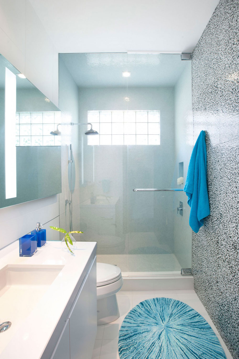 It is important to try to visually expand the space. This can be done with the help of bedding, a neutral palette and white in different shades. Bright accents such as brush holders will help to dilute the created interior. Monotony will quickly tire the eye. Therefore, you should combine tones. Glossy ceiling adds space. Tile choose smooth. It is recommended to lay the flooring diagonally. The tiles for this are chosen a few tones darker than the rest of the finish.