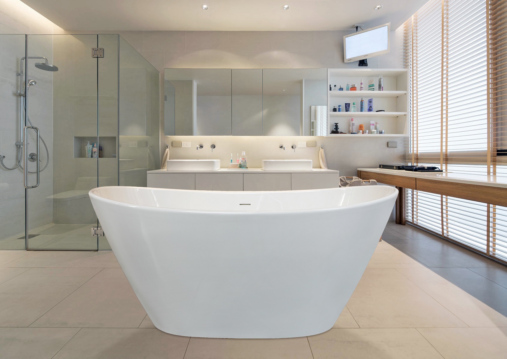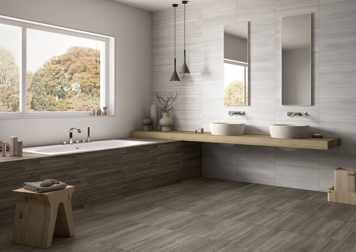Bathroom design in beige with porcelain stoneware