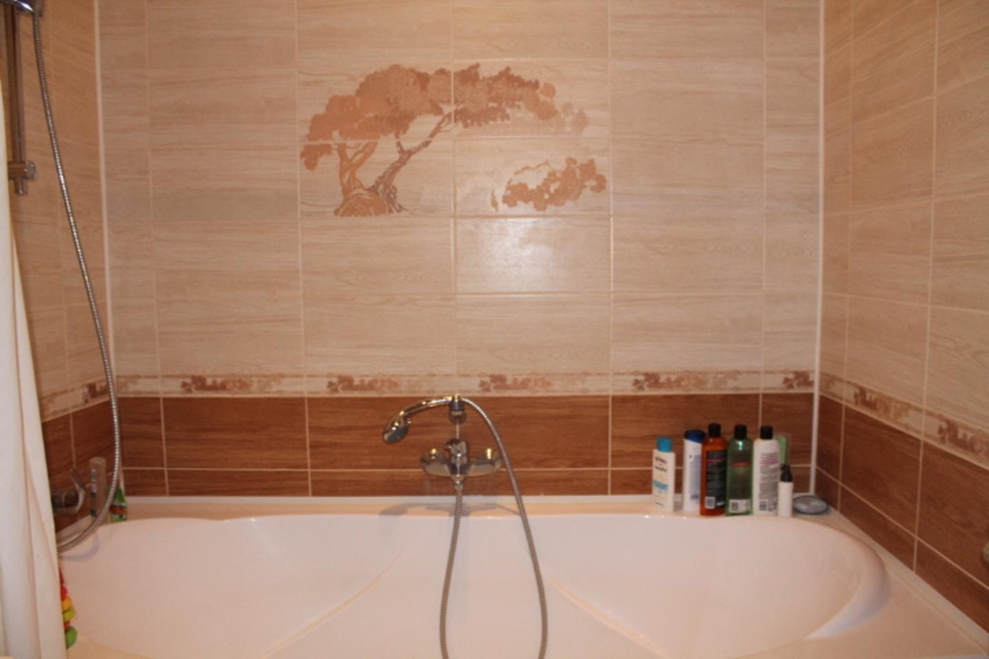 The walls of the bathroom are decorated with ceramic tiles.