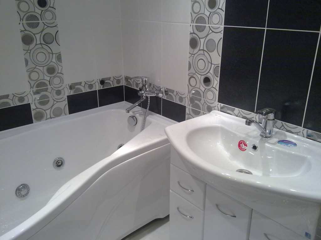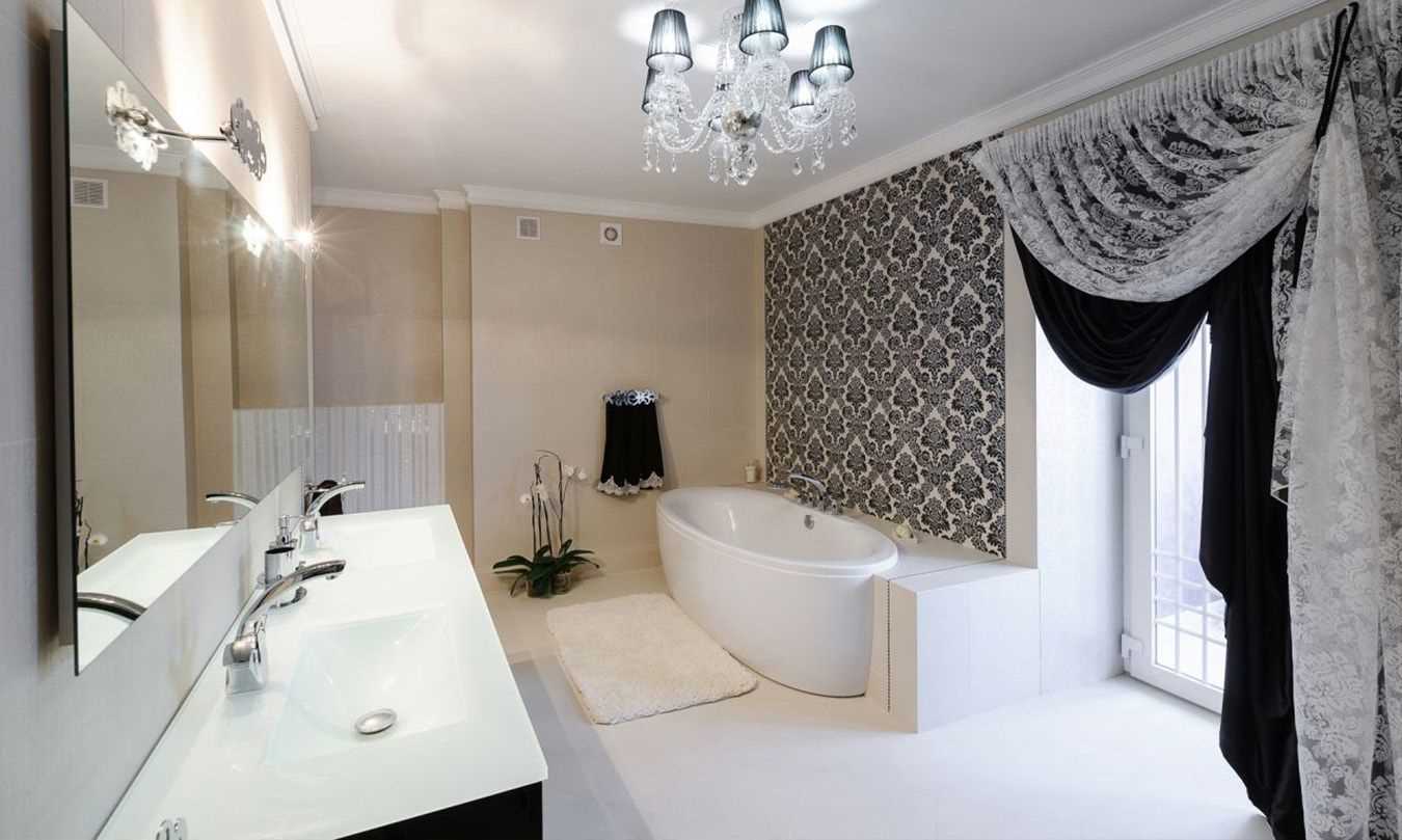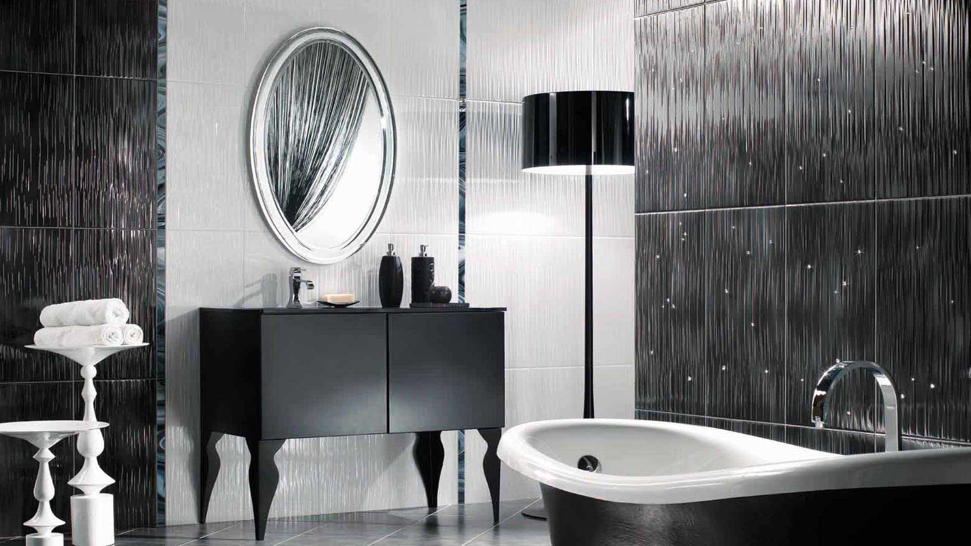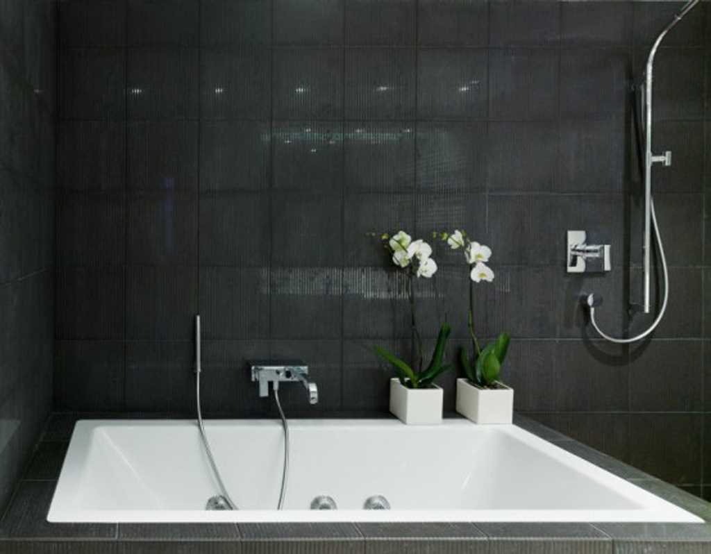 The most popular material for decorating the bathroom has long been ceramic tiles. In stores, it is presented in a huge assortment. Depending on the style you have chosen, the tile may be plain or have some kind of ornament. In a light interior where black is present only as a contour, light ceramics with an interesting black pattern will look beautiful and vice versa. But the ornament is better not to use on all walls, but only on one or two adjacent ones.