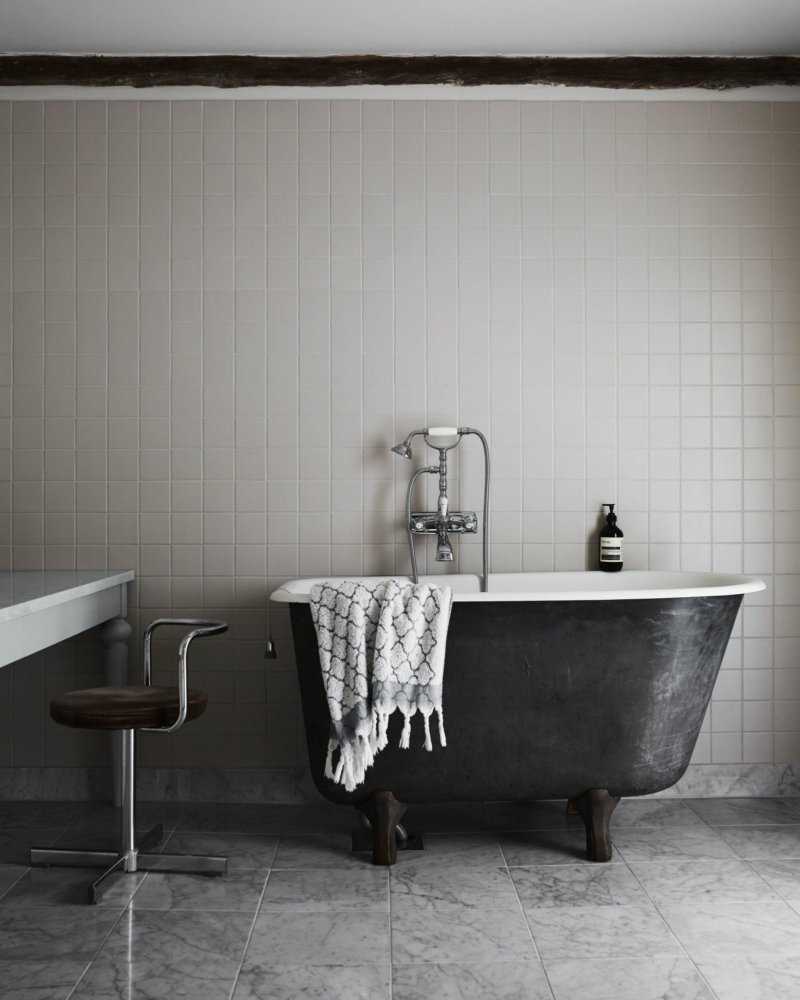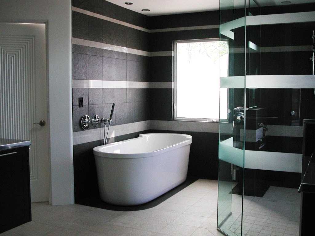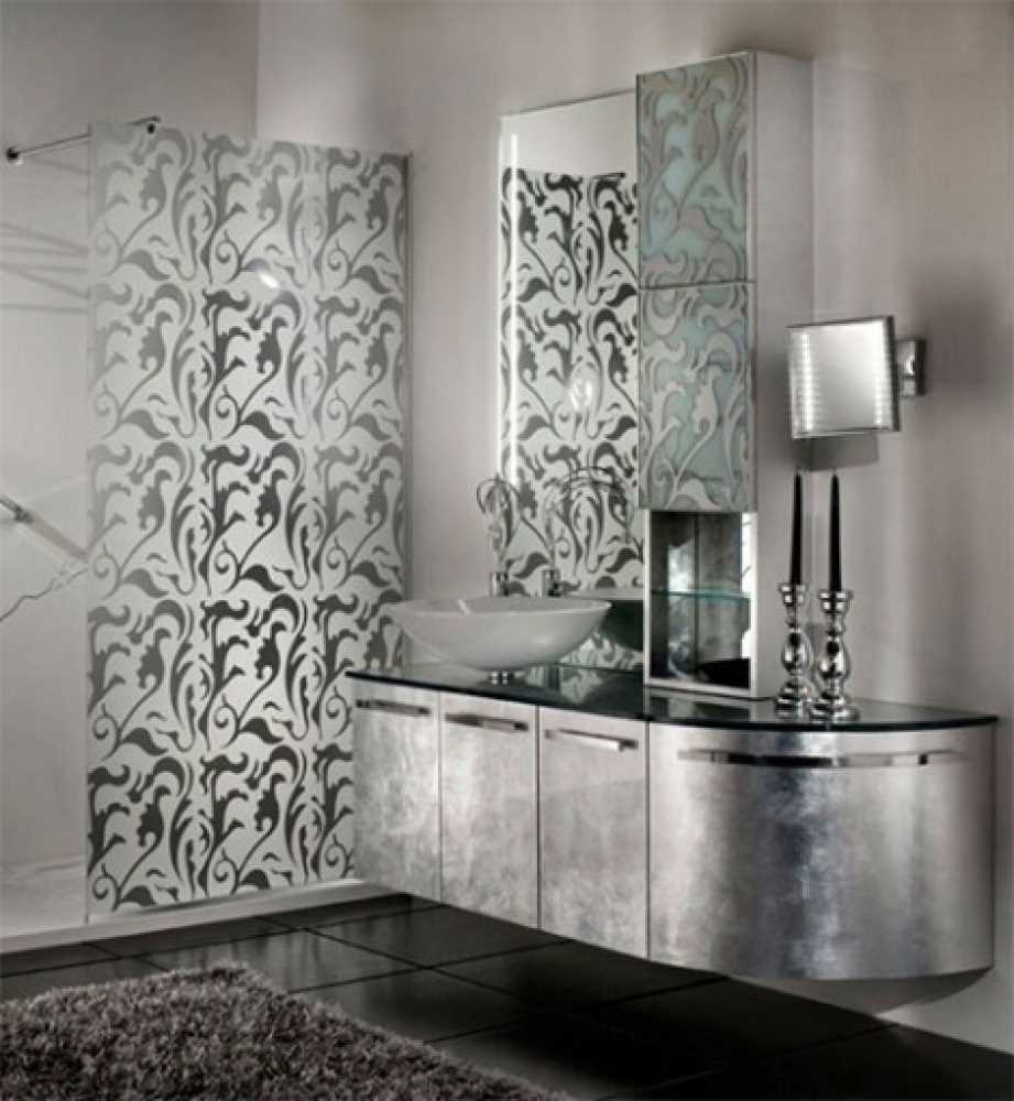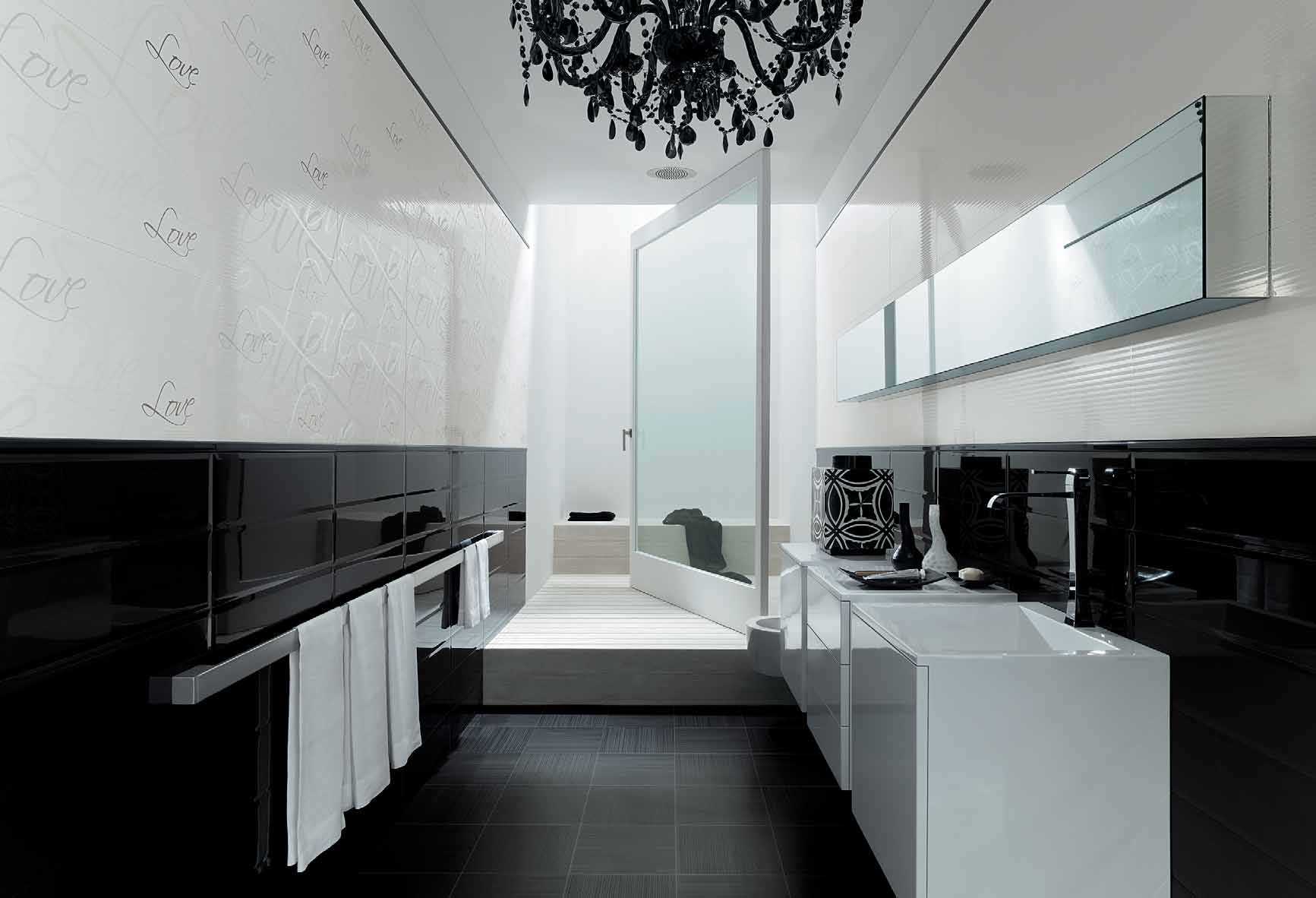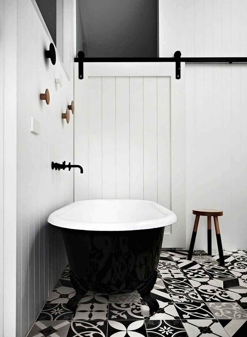 The most popular material for decorating the bathroom has long been ceramic tiles. In stores, it is presented in a huge assortment. Depending on the style you have chosen, the tile may be plain or have some kind of ornament. In a light interior where black is present only as a contour, light ceramics with an interesting black pattern will look beautiful and vice versa. But the ornament is better not to use on all walls, but only on one or two adjacent ones.